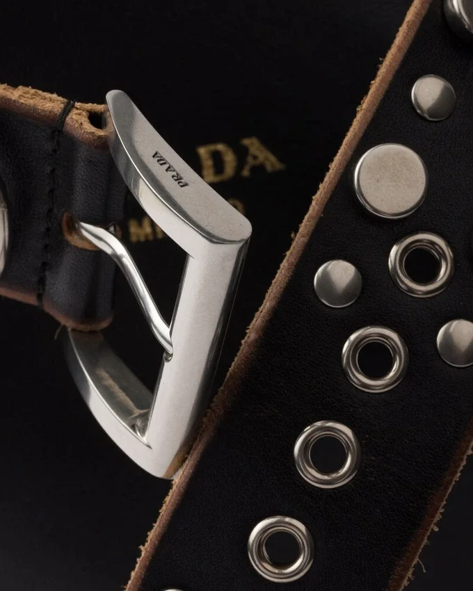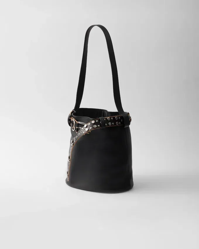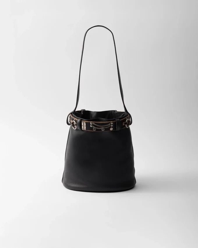 The Eclectic and Modern Essence of the Prada Buckle Bag is Rediscovered in a New Bucket Silhouette with a Sleek Shape. Bold Contrasts Brighten the Soft Design, Embellished with a Studded Belt with a Punk Aesthetic That Adds an Unexpected, Contemporary Touch.