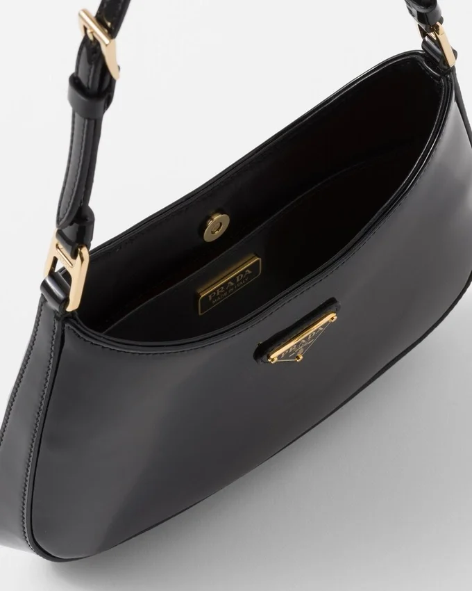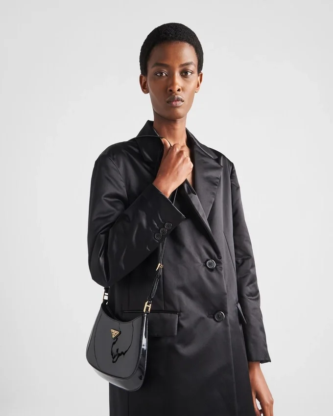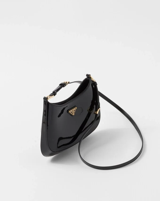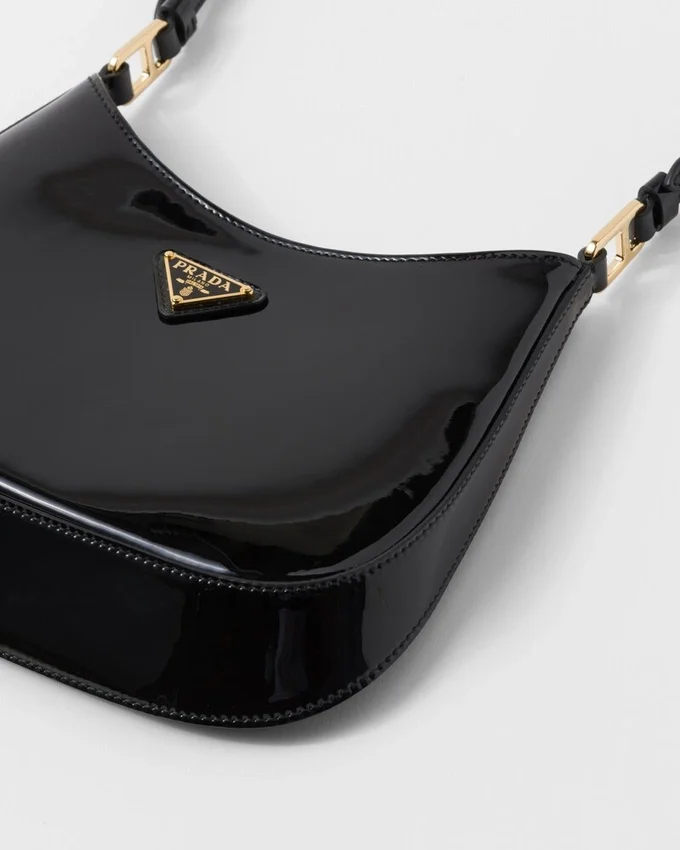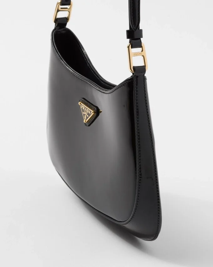 The Prada Cleo Bag with Sophisticated Allure Reinterprets an Iconic Design of the Brand from the Nineties. Sleek, Curved Lines Emphasized by the Distinctive Sloping Silhouette on the Bottom and Sides Give This Hobo Bag a Soft, Light Look. The Accessory is Made of Exclusive Patent Leather That Creates a Elegant Shiny Effect.