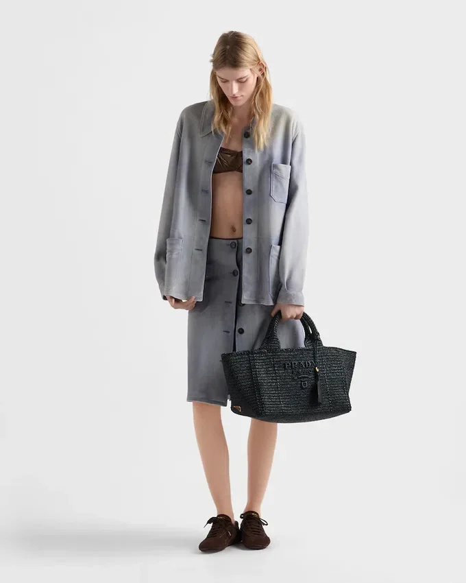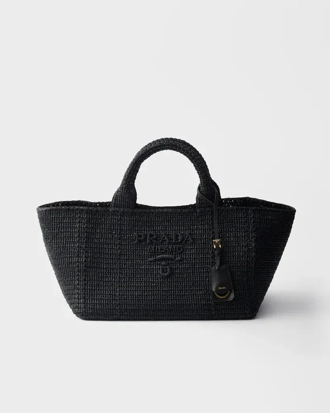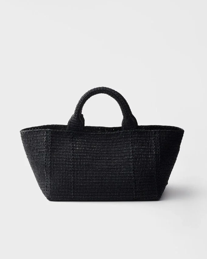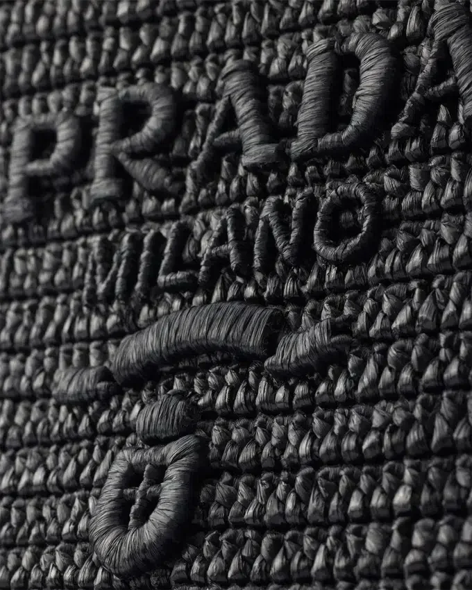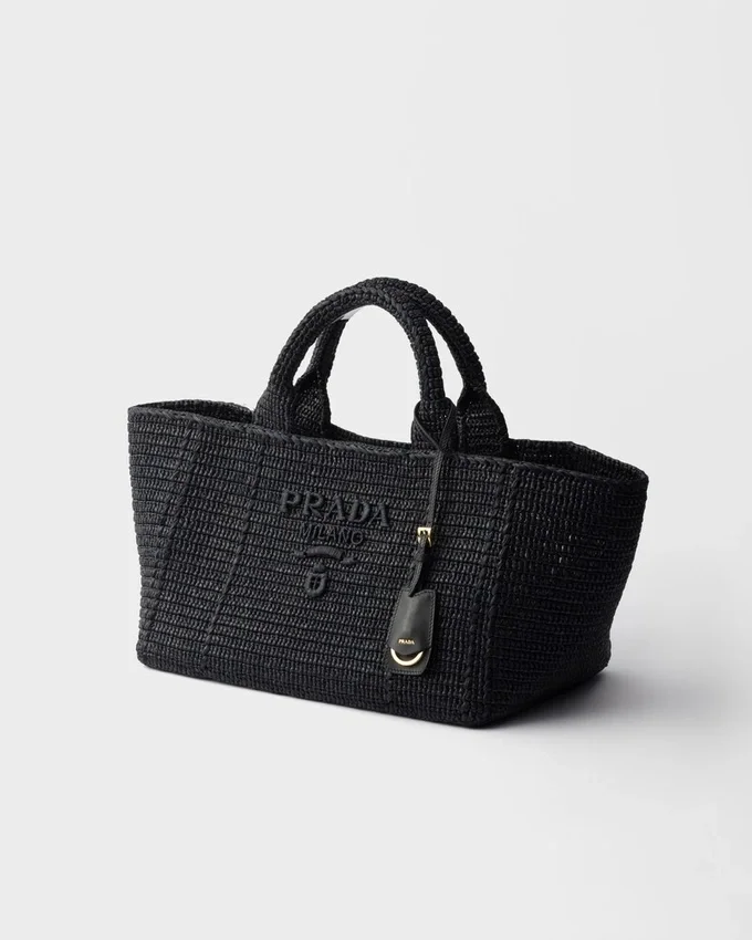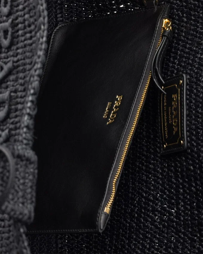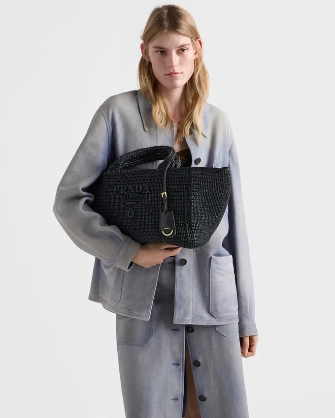 This Tote Bag with a Soft, Deconstructed Design is Made of a Raffia-Effect Fabric, a Light Material That Recalls a Summer Atmosphere. Embroidered on the Front, Prada’s Iconic Macro Lettering Logo Enriches the Silhouette.