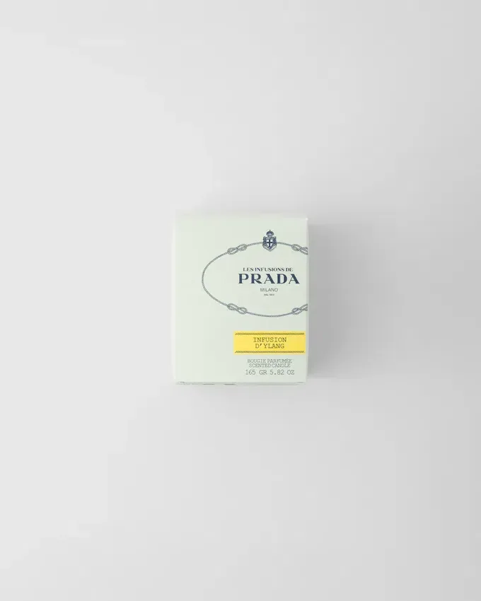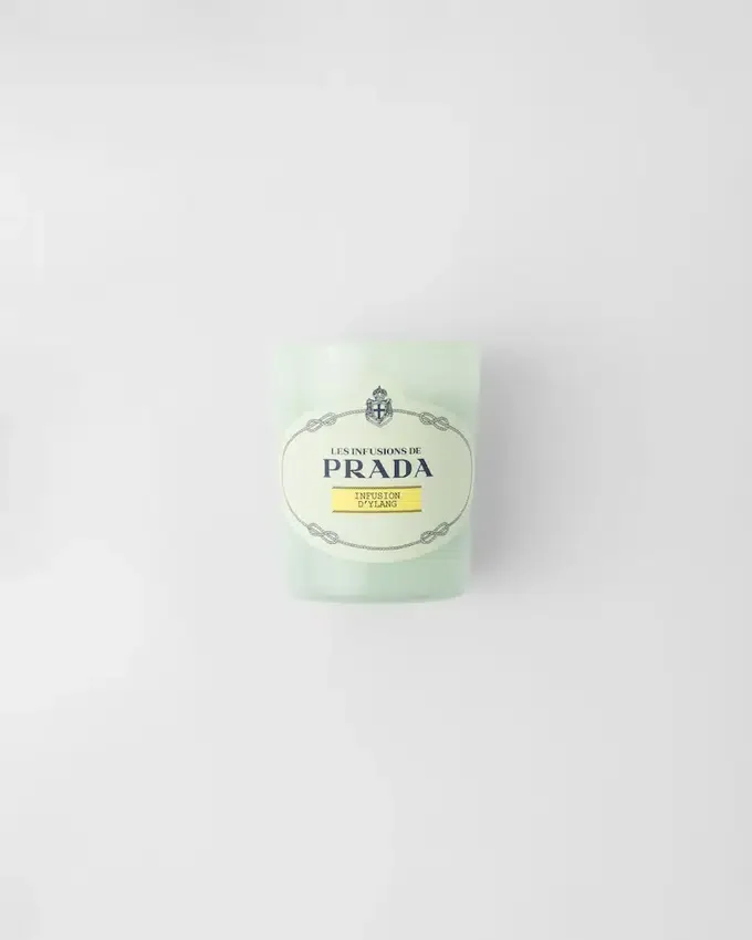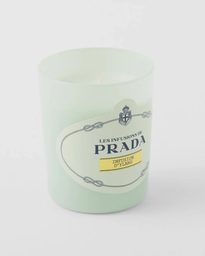 Solar and Luxuriant, Infusion D’ylang Candle Reveals the Captivating Floral Notes of Ylang Blended with Bergamot and Spiced Cardamom, Enhanced with a Base Note of Sandalwood Accord.—Infusion D’ylang Candle Encapsulates All the Prada Codes Within an Elegant Prada Green Opaline Glass Signed by a Saffiano Embossed Label in the Shape of the Historical Logo. This Luxurious Object Brings Home the Sophisticated Spirit of Prada.