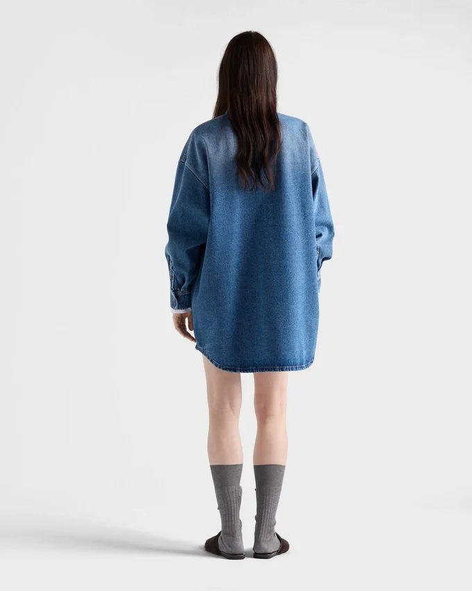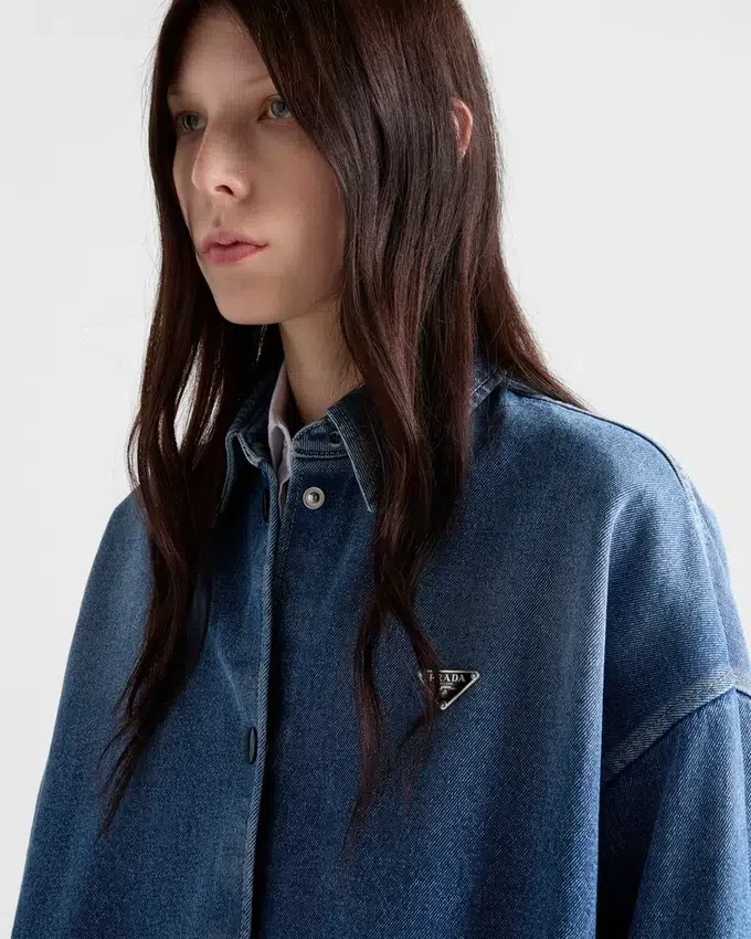 This Denim Shirt with a Used Finish Has an Oversized Silhouette That Gives It a Relaxed, Casual Style. The Enameled Metal Triangle Logo Completes the Garment with an Iconic Note.