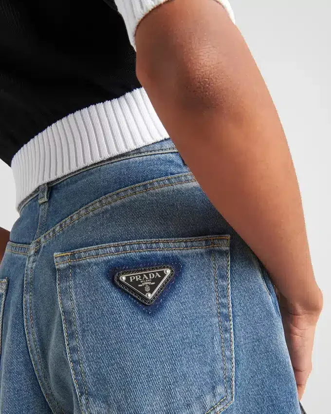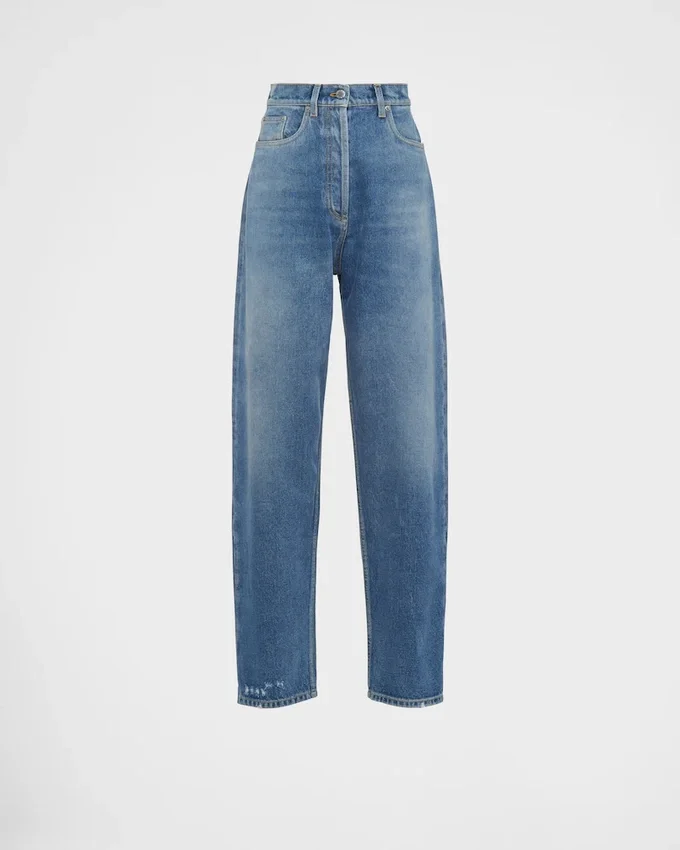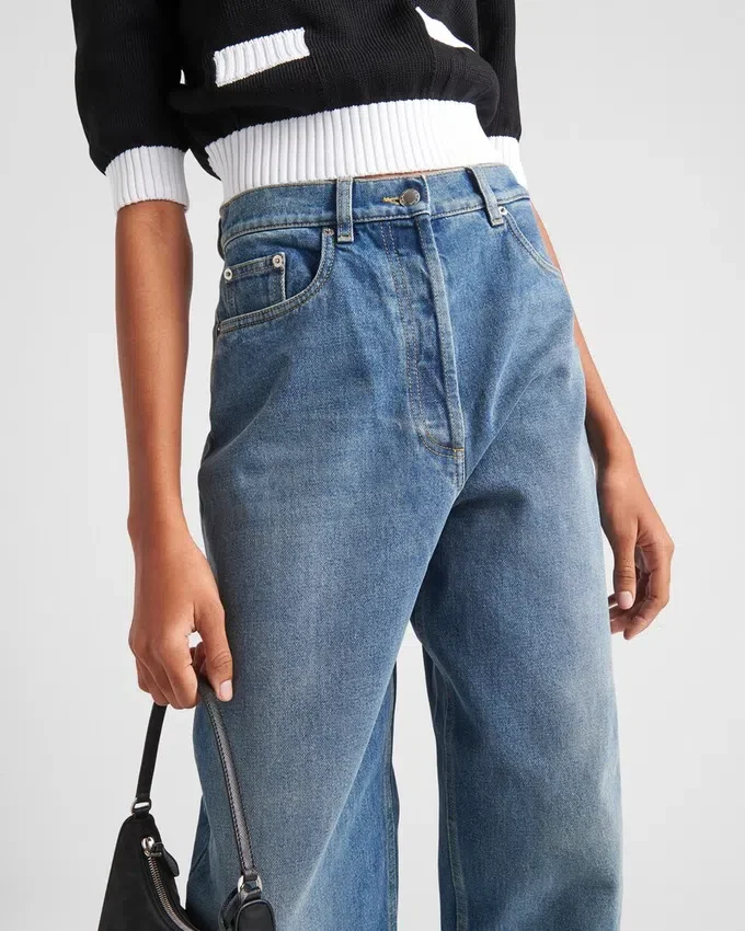 These Jeans with a Boyfriend Cut, High Waist, and Wide Leg Are Treated to Create a Worn, Used Effect That Gives Them Vintage Allure. Contrasting Top-Stitching Outlines the Five-Pocket Style That is Accented on the Back with the Emblematic Enameled Metal Triangle Logo.