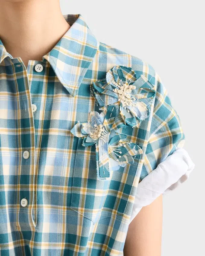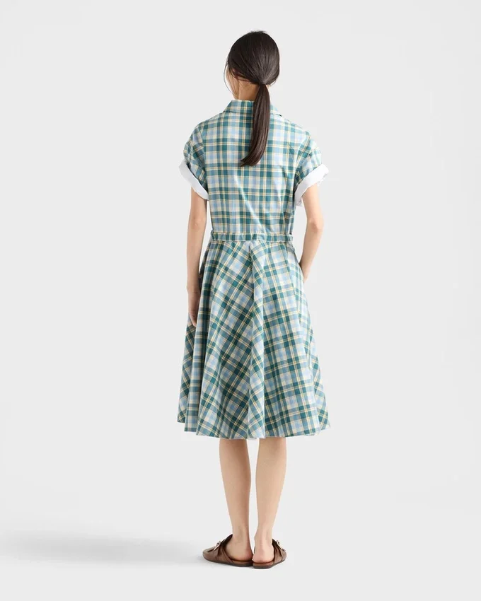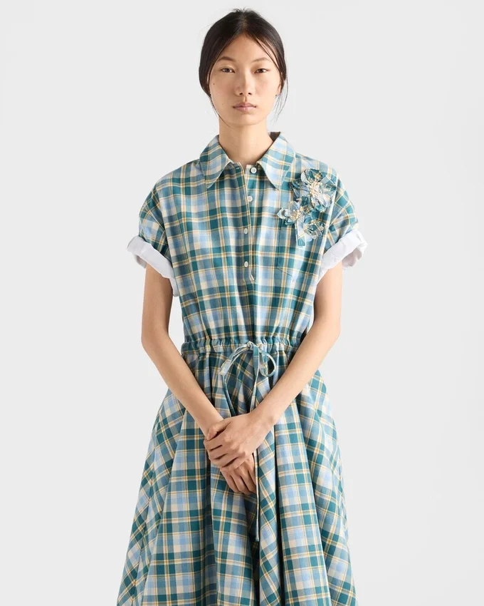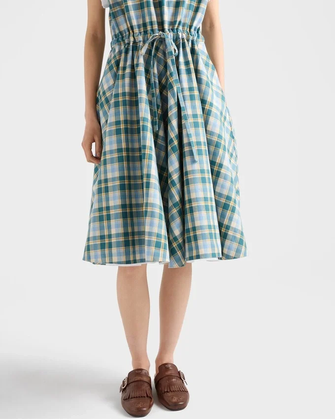 A Fresh and Modern Interpretation of a Check Print Enriches This Loose Cotton Dress. The Light Silhouette Defined by the Circle Skirt and Drawstring Waist is Completed by a Refined Tonal Floral Patch.