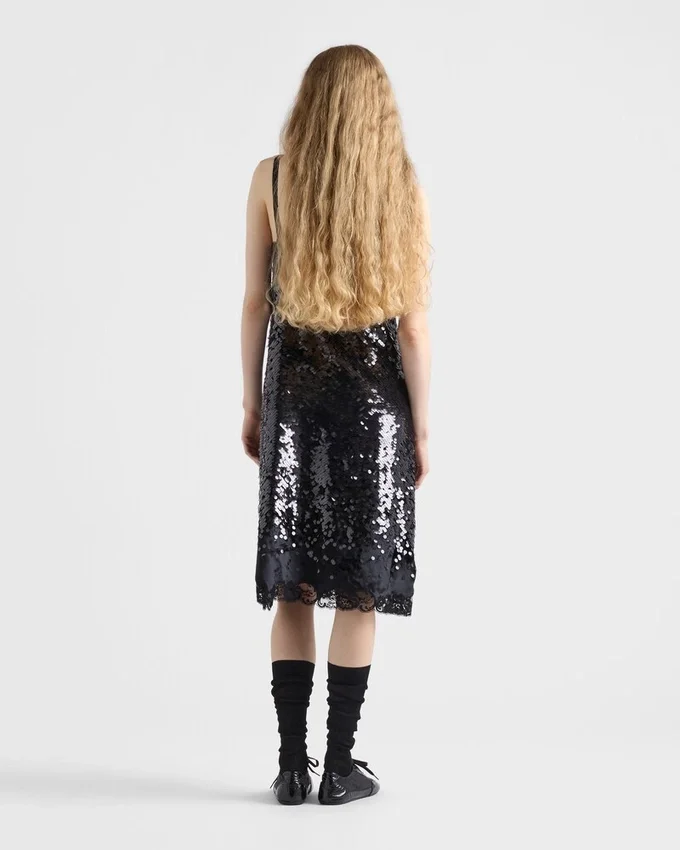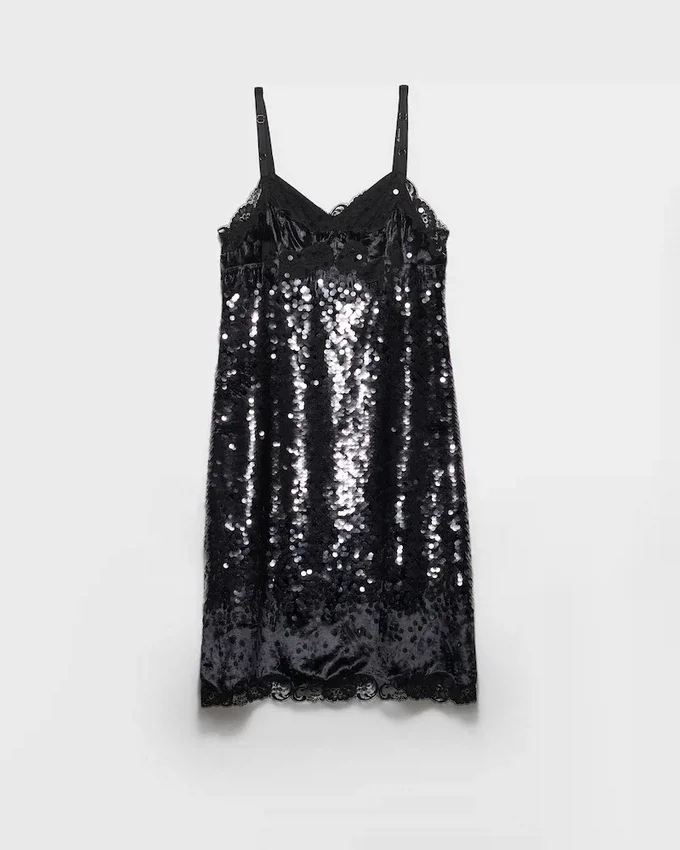 Sophisticated Interactions Blending Lingerie Silhouettes and Precious Materials Define Delicate, Contemporary Elegance. This Velvet Dress is Completed with Lace Trim and Gradient Sequins.