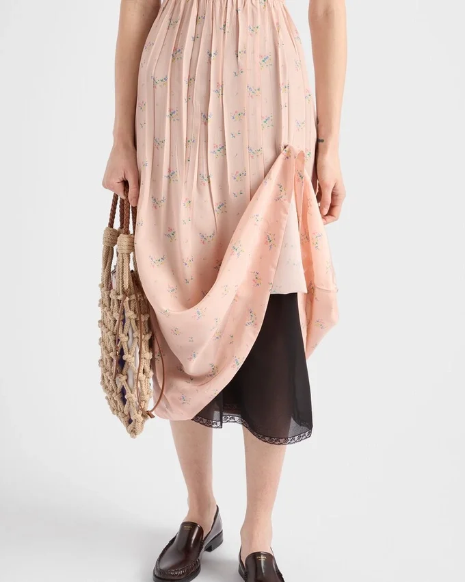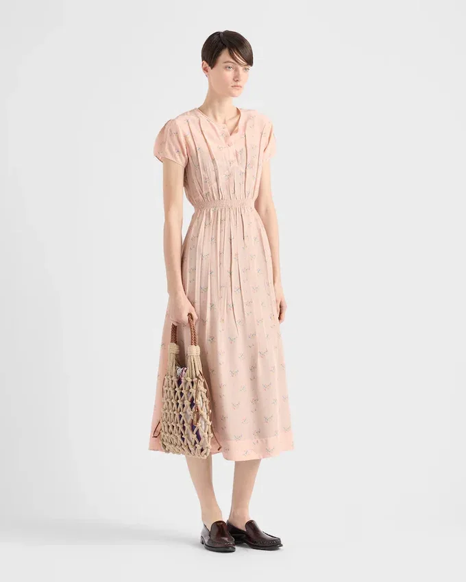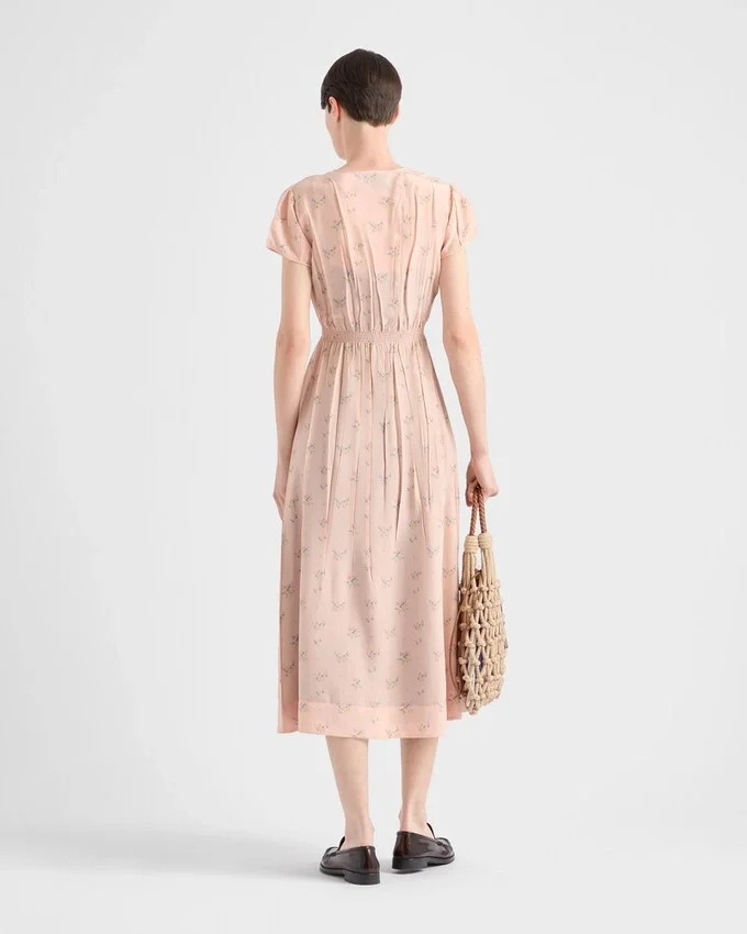 A Delicate Floral Print Enriches This Light Dress with a Fit-And-Flare Silhouette Featuring a Skirt with Softly Flared Lines. The Design is Characterized by a Deliberately Wrinkled Effect, a Distinctive Detail of Prada Collections.