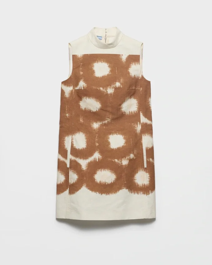 This Canvas Mini-Dress, a Pure Expression of Prada’s Unconventional Aesthetic, Blends Past and Present, Creativity and Rigor. The Sleek Silhouette Combines Clean Lines with the Modernist, Geometric Character of the Abstract Print.