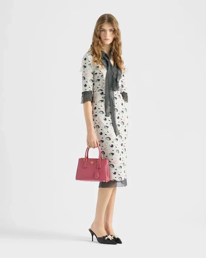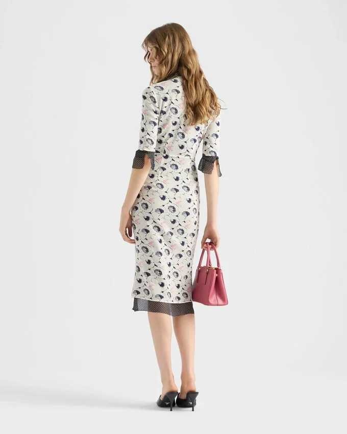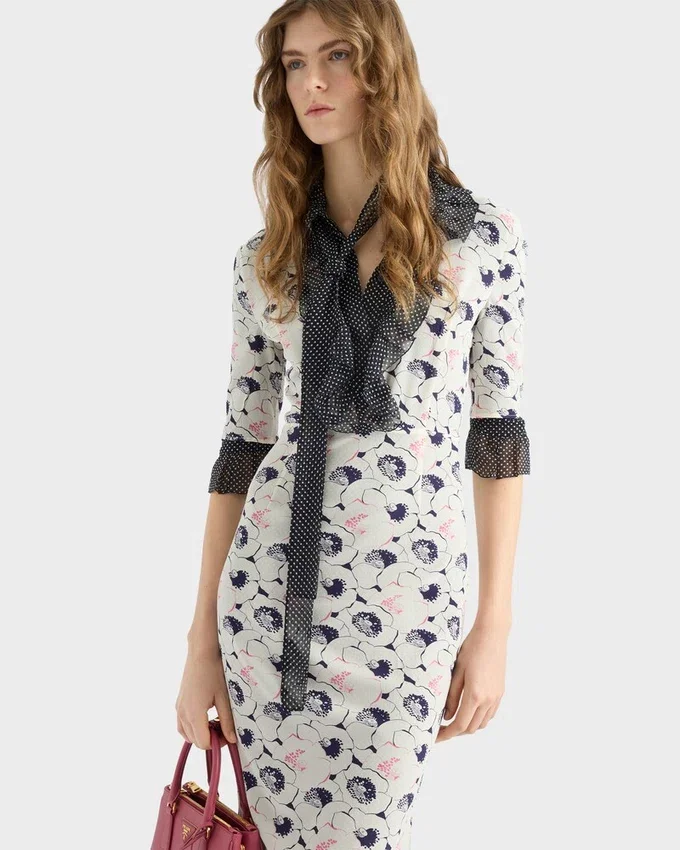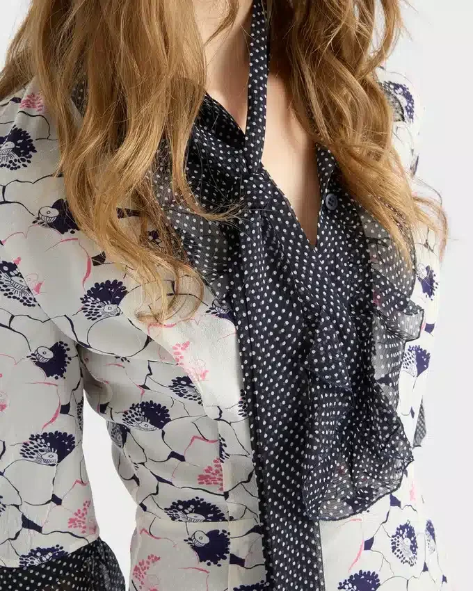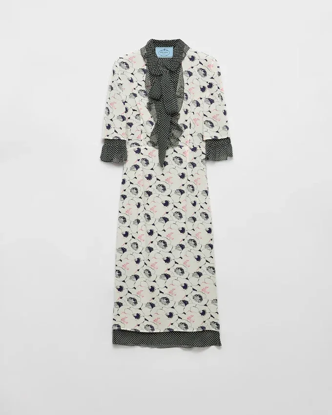Two Prints with Vintage Allure Animate This Georgette Dress with a V-Necked Sheath Silhouette. The Dress is Characterized by a Floral Motif in Contrast with the Polka-Dot Ruffles That Add a Light, Romantic Touch.