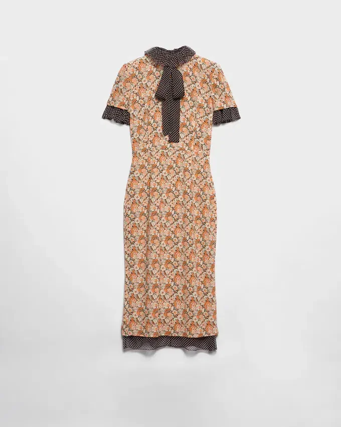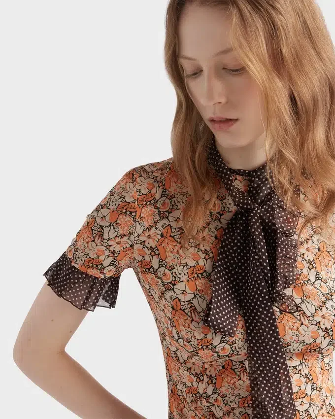 Two Prints with Vintage Allure Animate This Georgette Sheath Dress. The Dress is Characterized by a Floral Motif in Contrast with the Polka-Dot Ruching and Hem That Add a Light, Romantic Touch.