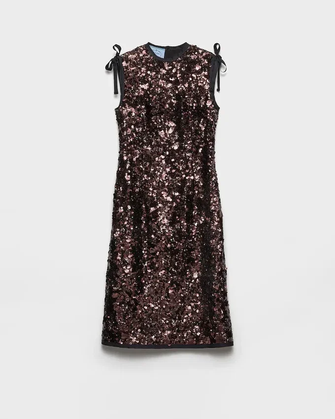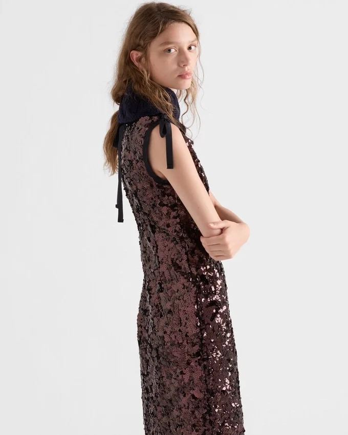 A Unique Texture with a Dynamic, Liquid Effect Characterizes This Elegant, Contemporary Dress Made with Refined Artisan Workmanship. The Sleek Design is Embellished with Hand-Embroidered Sequins That Create a Shimmering and Sophisticated Surface.