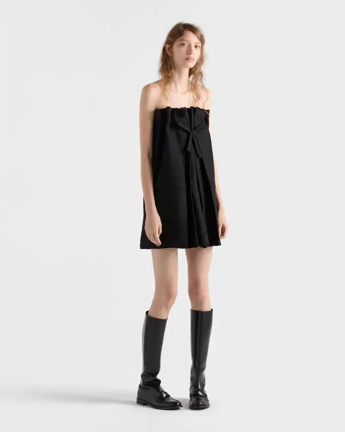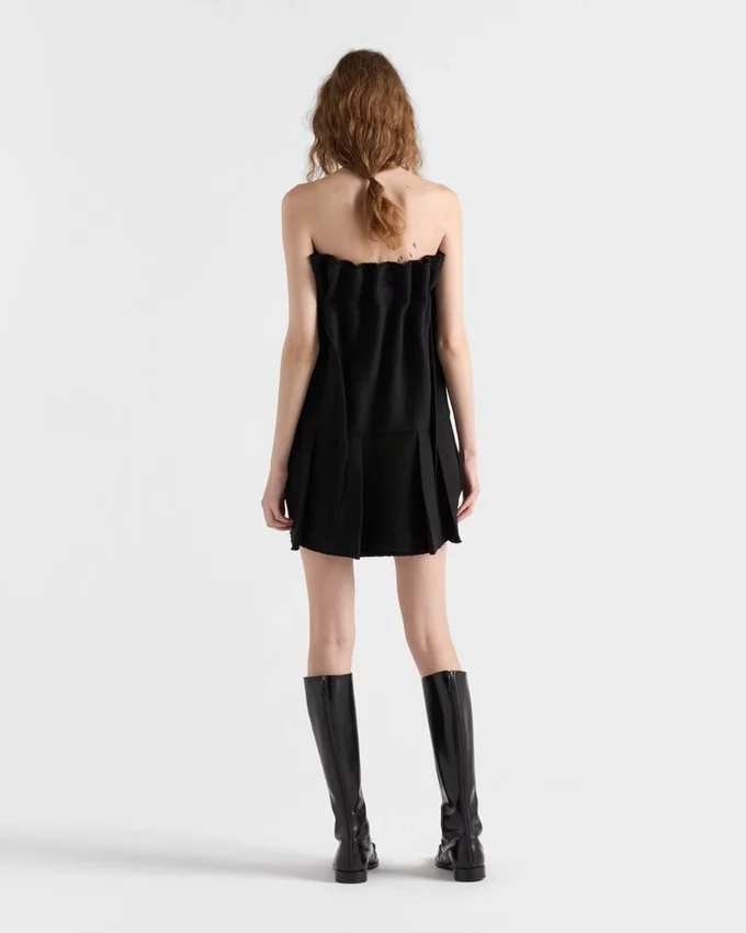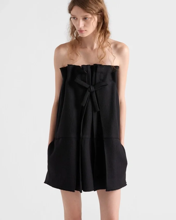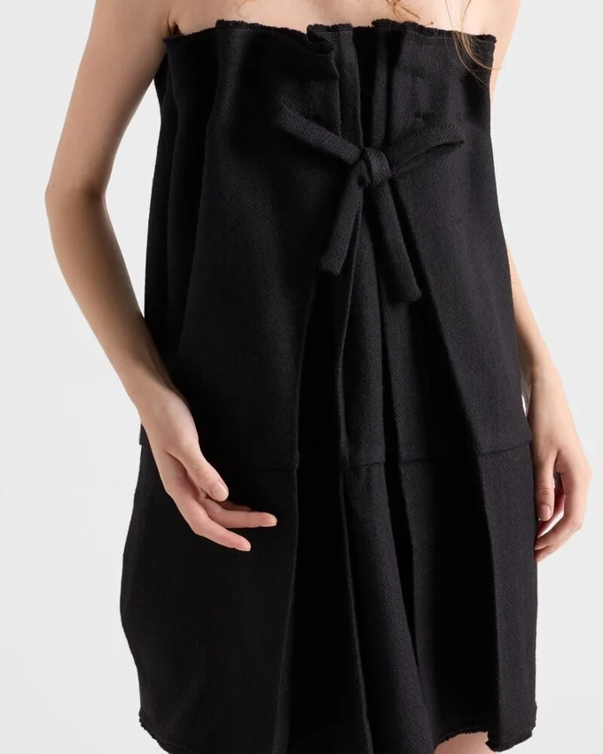 The Fall/Winter 2025 Collection Explores the Concept of Femininity and Redefines Its Symbols, Starting with the Black Dress. The Silhouette is Reimagined with New Proportions, Wide Lines, and Unique Details. Made from Chevron Wool, This Short Style Features a Draped Effect and a Tone-On-Tone Bow, While the Raw-Cut Hem Suggests an Instinctive and Unconventional Elegance.