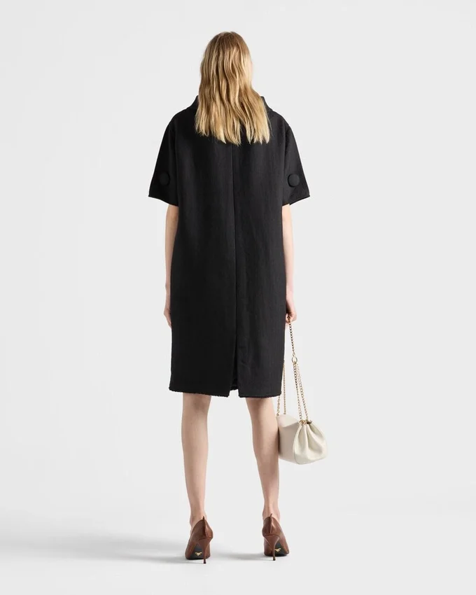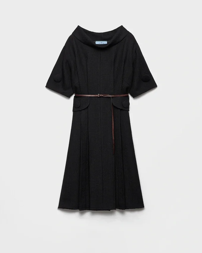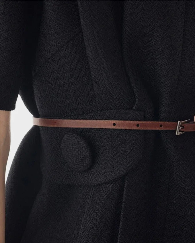 The Fall/Winter 2025 Collection Explores the Concept of Femininity and Redefines Its Symbols, Starting with the Black Dress. The Silhouette is Reimagined with New Proportions, Wide Lines, and Unique Details. Made from Chevron Wool, This Style Features a Boat Neckline, a Contrasting Leather Belt, and Oversized Buttons, While the Raw-Cut Hem Suggests an Instinctive and Unconventional Elegance.