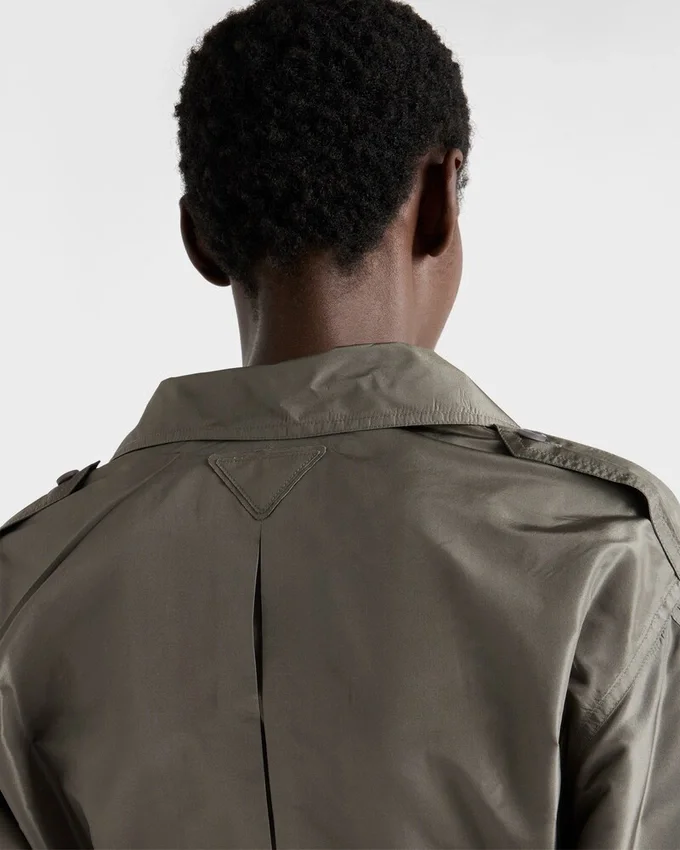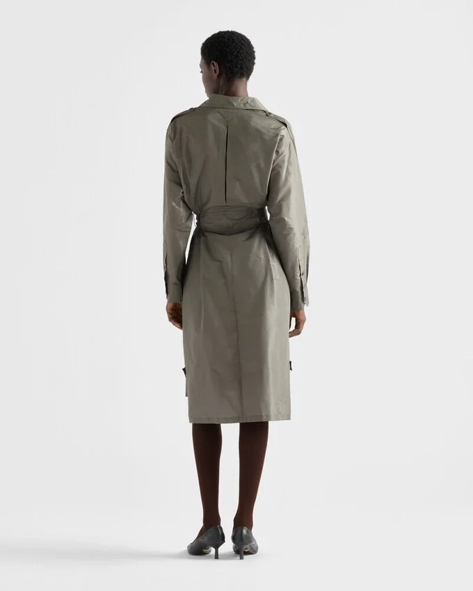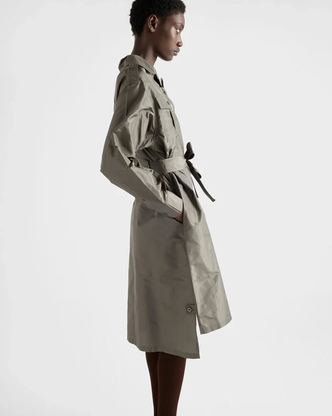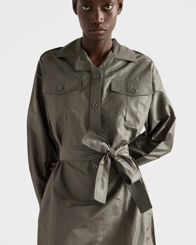 Sartorial Rigor Melds with the Light Lines of This Shirt Dress, an Expression of Poetic and Casual Elegance. The Taffeta Dress Combines Softness and Structure in a Silhouette That Redefines a Prada Wardrobe Classic.