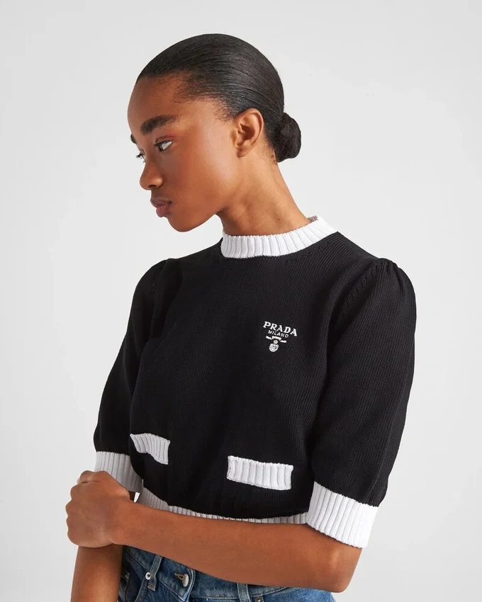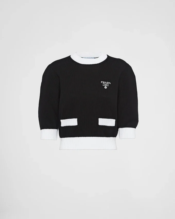 This Refined, Elegant Crew-Neck Sweater is Defined by Its Minimalist Design and Color Contrasts That Give It Retro Charm. The Ribbed Knit Trim and Saddle Shoulder Accentuate the Femininity of the Garment Decorated with the Embroidered Logo.