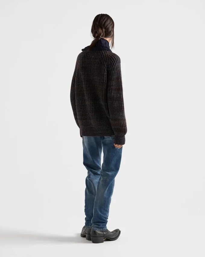 A Play of Delicate Nuances Animates This Cardigan with an Oversized Fit. Mouliné Wool Gives Structure and Dimension to the Silhouette Enriched by the Ribbed Knit and Decorated with the Triangle Logo.