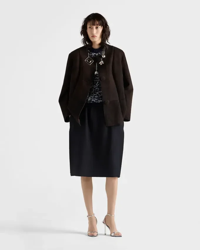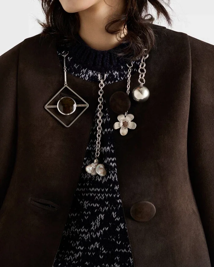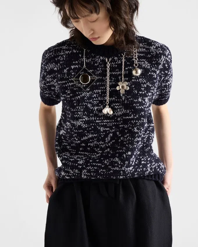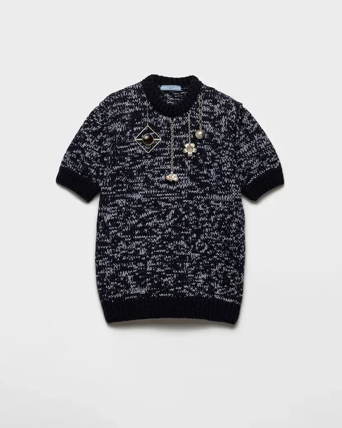 For the Fall/Winter 2025 Collection, Knitwear is Enriched with Jewel Details and Precious Embellishments. This Short-Sleeved Wool Sweater with a Soft, Oversized Silhouette is Embellished with Metal and Stone Pendants in a New Dialog Between Classic Shapes and Symbolic Meanings.