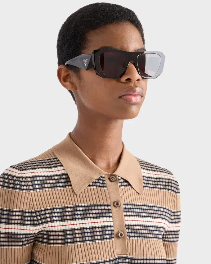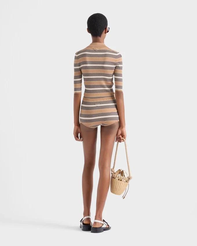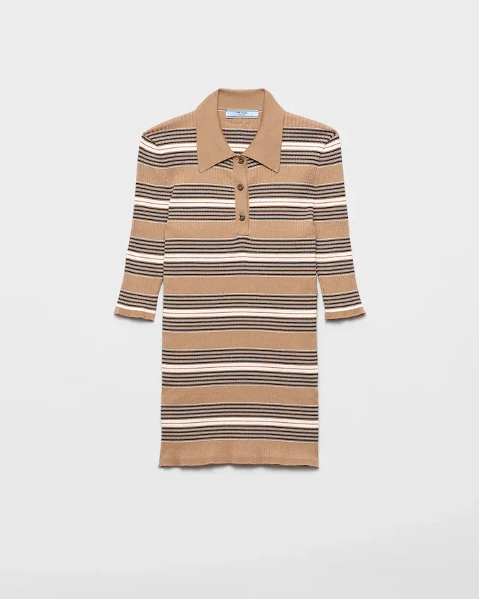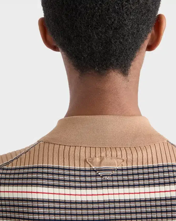 A Stripe Motif with Vintage Allure Animates This Slim Fit Polo Shirt Made of Ribbed Knit Cotton. The Tonal Triangle Logo Decorates the Refined Garment.
