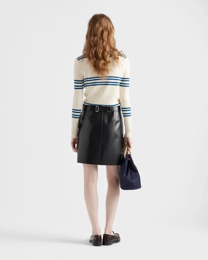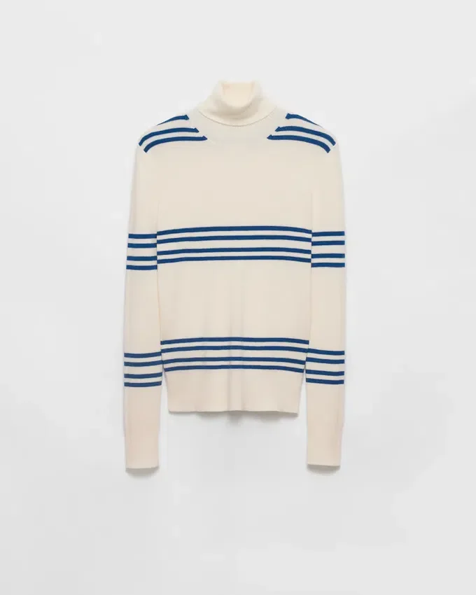 This Wool Turtleneck Features a Stripe Motif That Adds a Dynamic Touch to a Classic Silhouette. The Sleek Geometric Shape of the Triangle Logo Adds Its Signature to the Refined Garment.