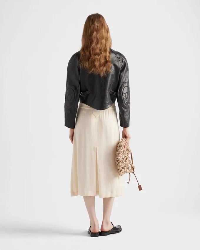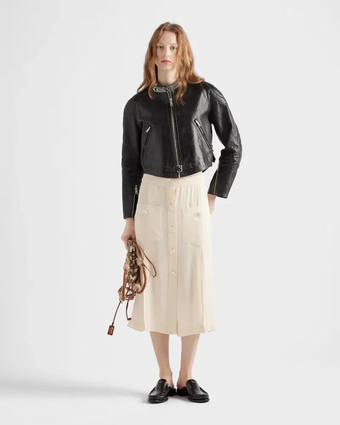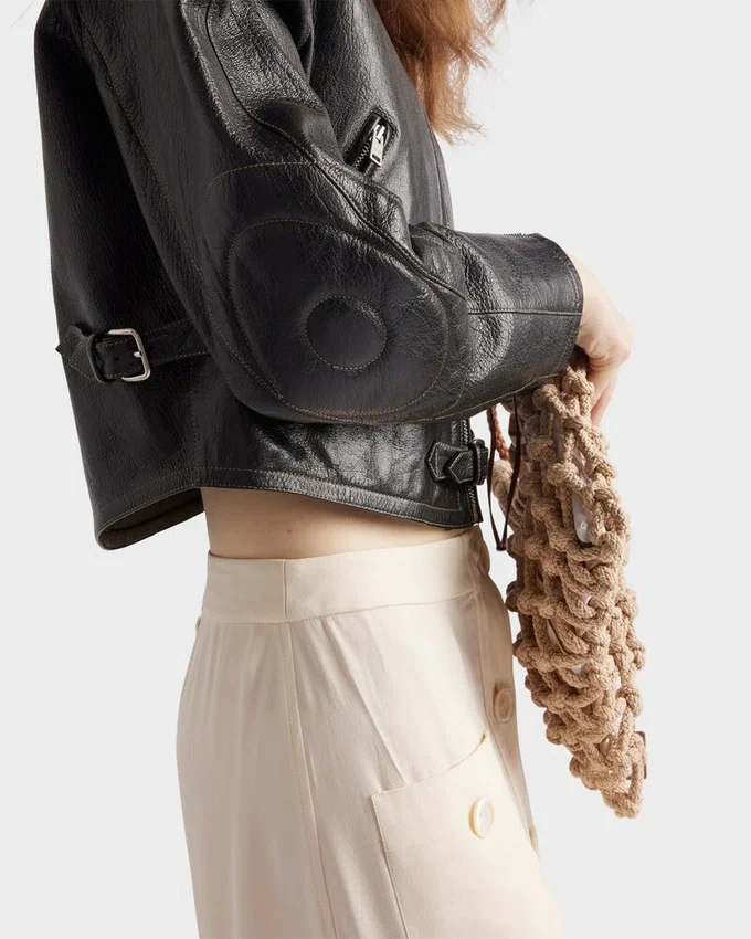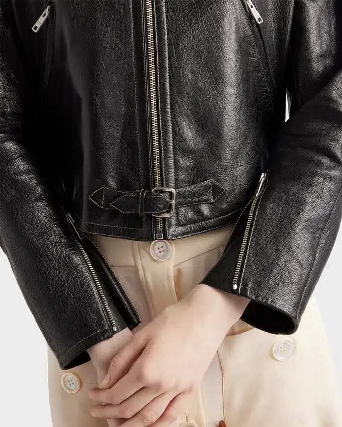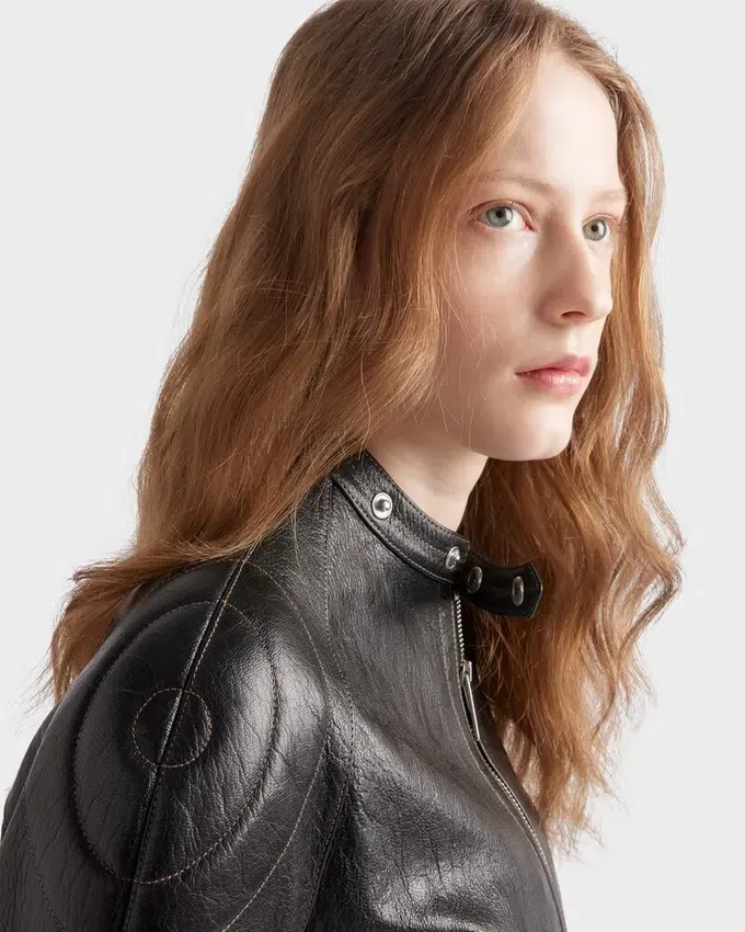 The Biker Jacket is Reinterpreted with a Rounded Silhouette, Enhanced by Hand-Treated Leather for a Vintage Finish. Top-Stitching Outlines the Jacket with Bold Style, Completed with a Band Collar and Refined Notes with Vintage Allure.
