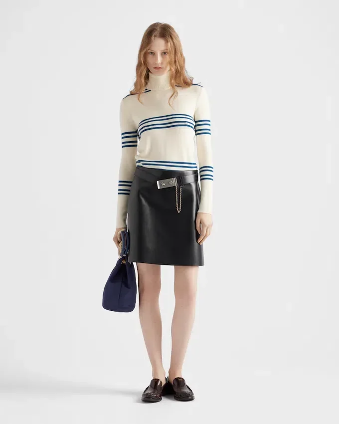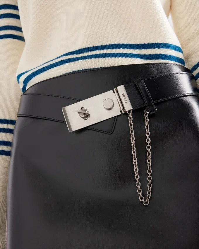 This Leather Miniskirt with Sleek Lines and a Refined Design is Characterized by Its Slightly Flared Cut. The Belt with Metal Buckle from the Archives Enhances the Silhouette with an Iconic and Timeless Touch.