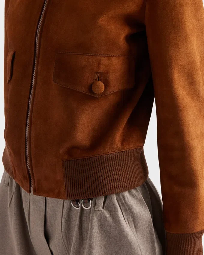 An Attention to Detail Characterizes This Suede Blouson Jacket Featuring a Soft Silhouette with Ribbed Knit Trim. The Artisan-Crafted Leather Gives the Garment Vintage Allure and Distinctive Style. The Tonal Triangle Logo Completes the Design with an Iconic Note.