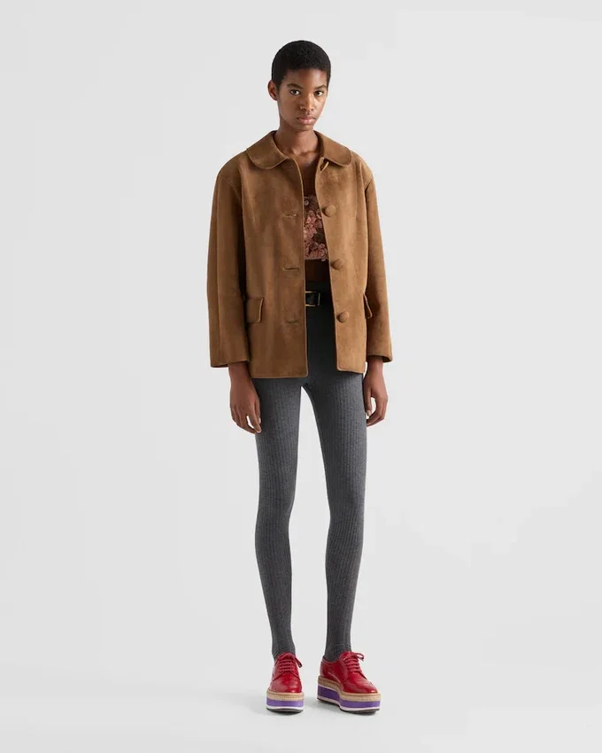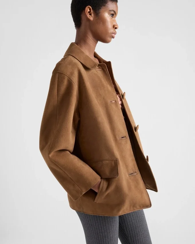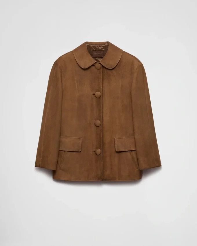 Soft, Rounded Lines Define the Silhouette of This Jacket with Retro Charm, Emphasized by the Sophisticated Texture of Suede.