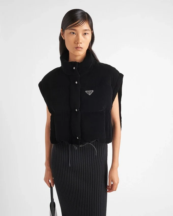 Oversized Volumes and New Materials Mix to Create a New Outerwear Concept That Reflects the Characteristic Duality of Prada Collections. This Cropped Velvet Down Jacket Reveals Its Versatile Hybrid Soul, Transforming into a Vest Thanks to the Removable Sleeves. The Brand’s Emblematic Enameled Metal Triangle Logo Decorates the Design.