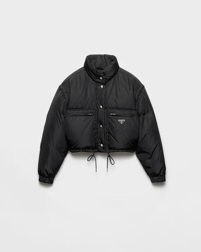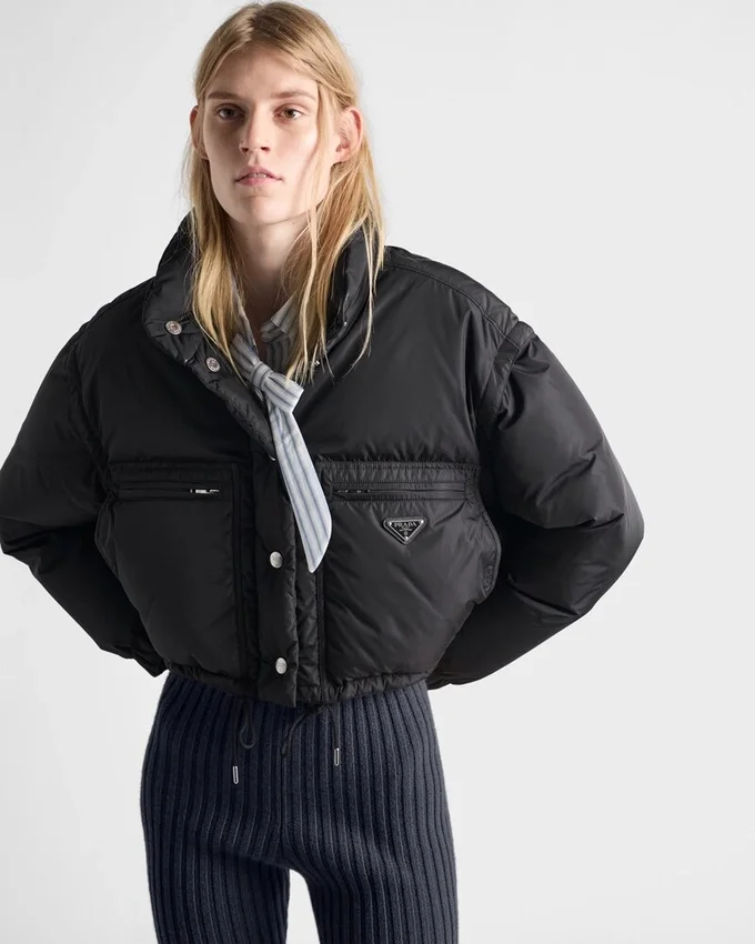 This Sports-Inspired Cropped Down Jacket with Goose Down Padding Has a Casual Attitude. The Garment with Rounded Volumes is Made of Re-Nylon, an Innovative Regenerated Nylon Yarn Produced from Recycled and Purified Plastic Materials Collected in the Ocean. New Proportions Emphasize the Silhouette Enhanced by the Ring Collar and Decorated with the Iconic Enameled Metal Triangle Logo. For Sustainable Care to Preserve the Product’s Characteristics and Reduce Microfiber Shedding, We Recommend Not Washing the Item Too Often. Let the Product Air out After Every Use and Have It Dry Cleaned at a Specialized Ecological Dry Cleaners.