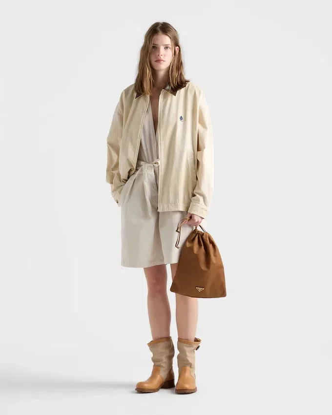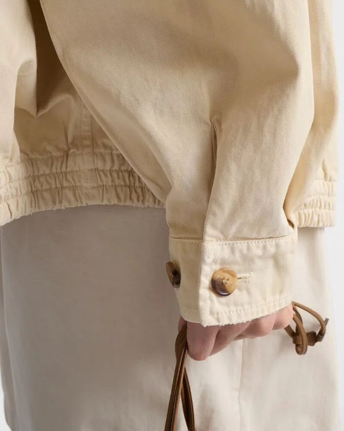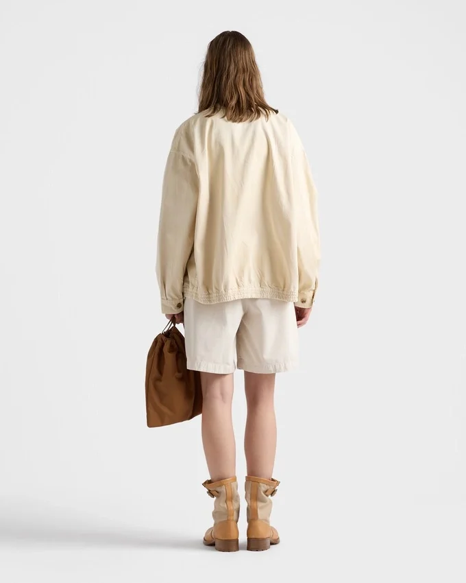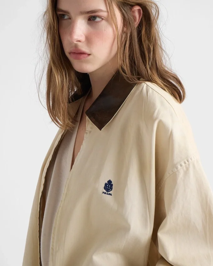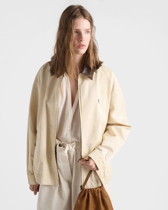 This Gabardine Blouson Jacket, the Perfect Synthesis of Functionality and Sophistication, is a Key Piece in the Prada Wardrobe. The Design Reinterprets a Workwear Classic with a Vintage Finish Created Using Artisan Processes That Create Dimension in the Fabric. The Silhouette with Ample Lines, Completed by the Leather Collar, is Characterized by the Zipper Closure and Contrasting Logo on the Front.