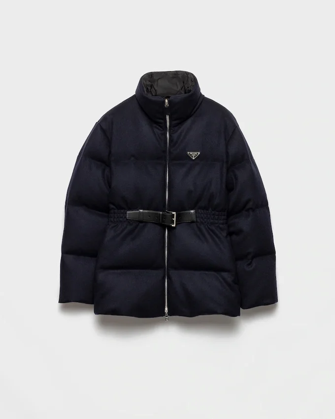 This Technical Garment Made of a Warm, Cozy Fabric Features Precious Materials and Details. The Belt and Metal Triangle Logo Add a Distinctive Note to This Style.