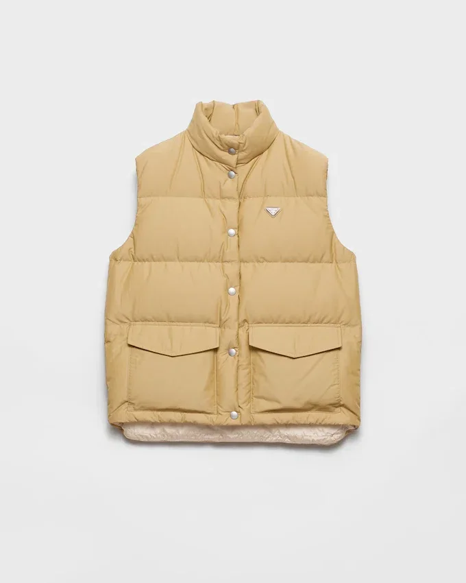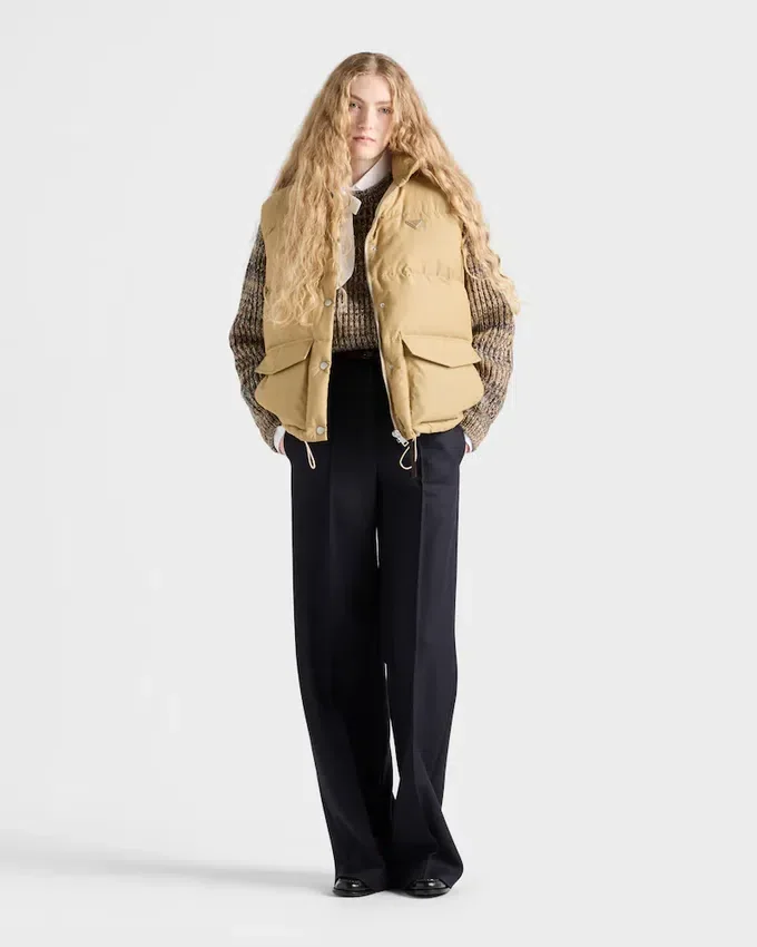 This Sporty and Contemporary Down Vest Has a Warm, Sophisticated Design. The Style with Goose Down Padding is Completed with Two Large Pockets and Zipper Closure, While the Enameled Metal Triangle Logo Adds a Distinctive Note.