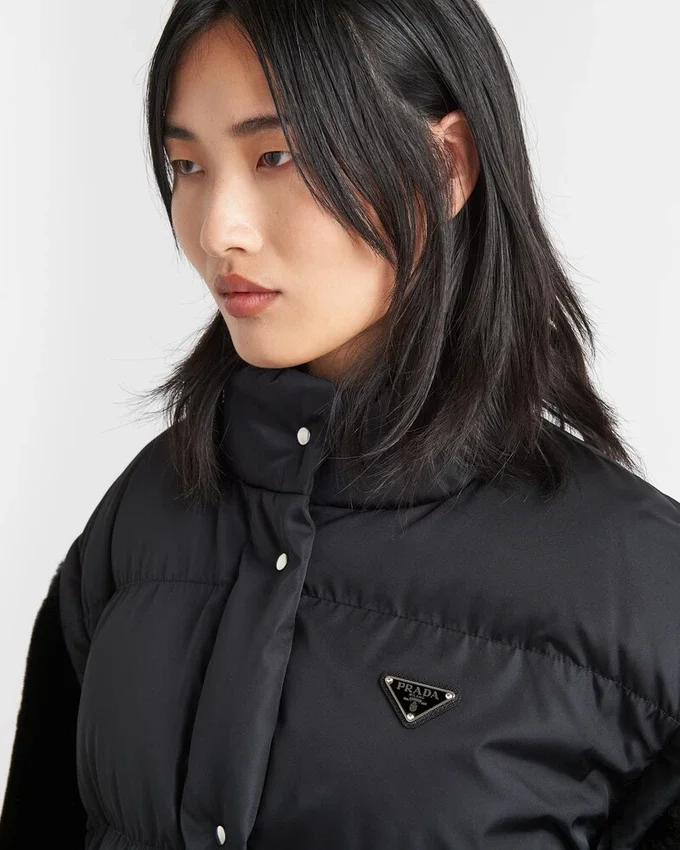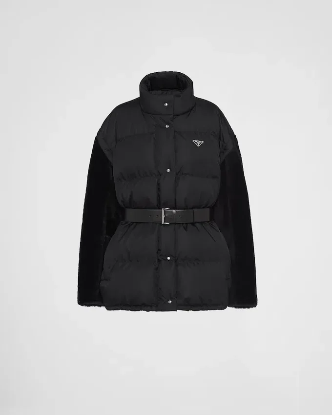 This Down Jacket with Contemporary Allure Combines the Functionality of Re-Nylon, an Innovative Fabric Made from Regenerated Nylon Yarn, with Unexpected Elements. The Silhouette with Enveloping Lines is Enhanced by the Leather Belt and Removable Shearling Sleeves. Contrasting Materials and Details Define This Versatile and Refined Garment Decorated with the Enameled Metal Triangle Logo. For Sustainable Care to Preserve the Product’s Characteristics and Reduce Microfiber Shedding, We Recommend Not Washing the Item Too Often. Let the Product Air out After Every Use and Have It Dry Cleaned at a Specialized Ecological Dry Cleaners.
