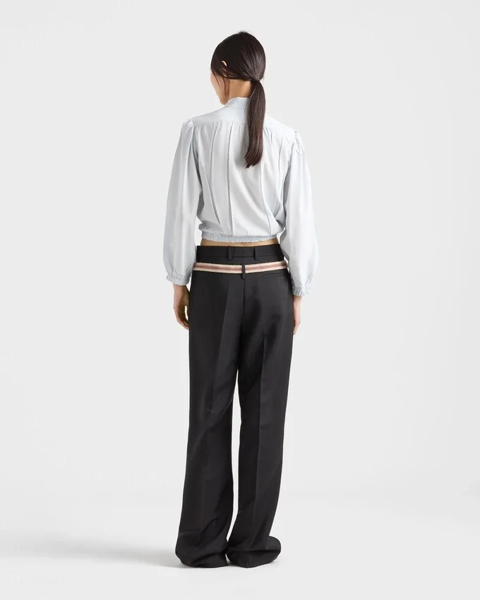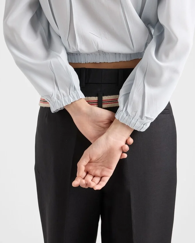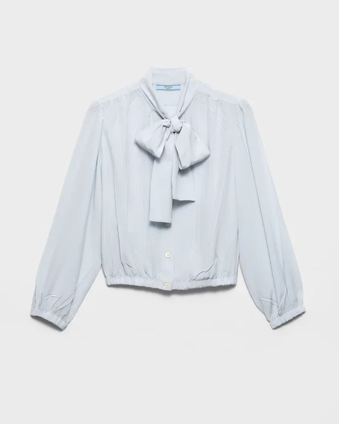 The Elegant Shirt is Reinterpreted in Crepe De Chine with a Distinctive Vintage Finish Created by Pressing the Finished Garment. An Unexpected Element, an Expression of Prada’s Unconventional Elegance, Adds Character to the Sophisticated, Feminine Design.
