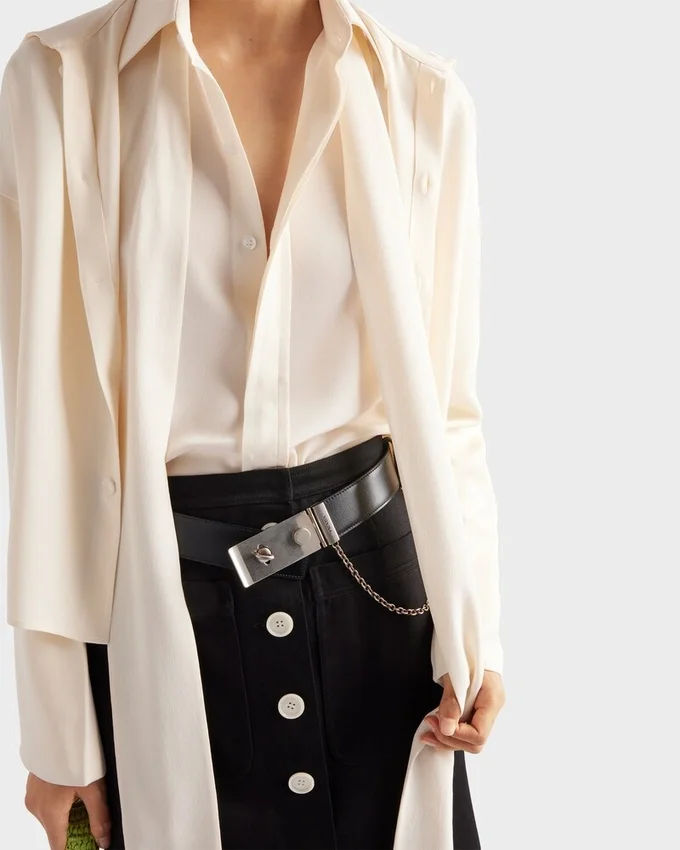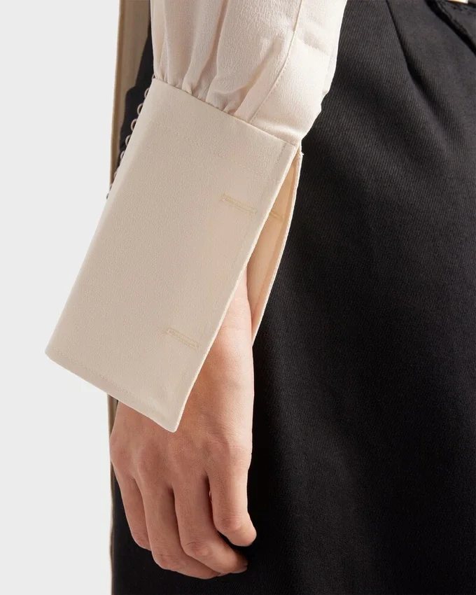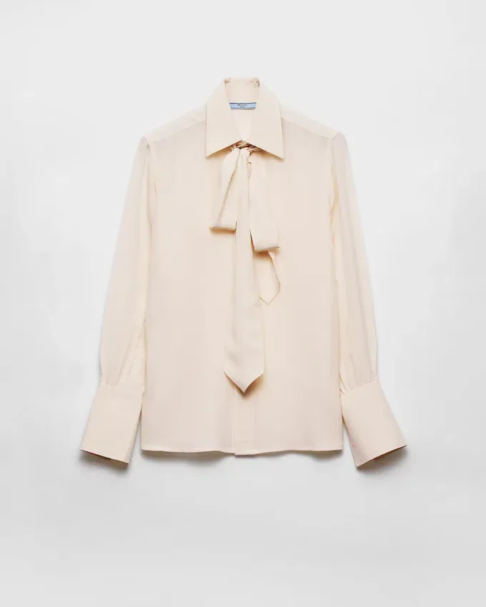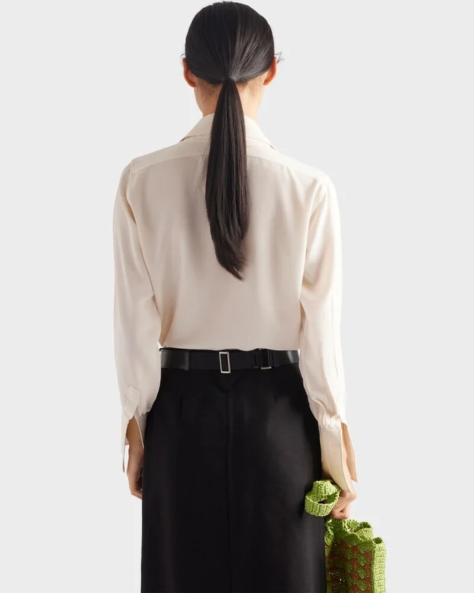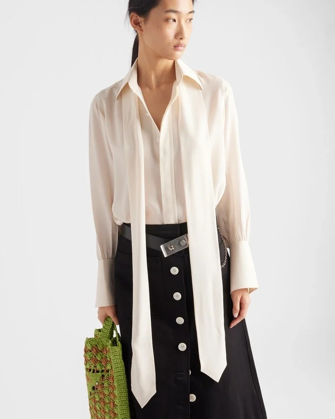 This Sophisticated and Timeless Marocain Shirt Features a Light Silhouette Defined by Formal Details and Romantic Notes. The Style is Characterized by a Deliberate Wrinkled Effect, a Distinctive Characteristic of Prada Collections.