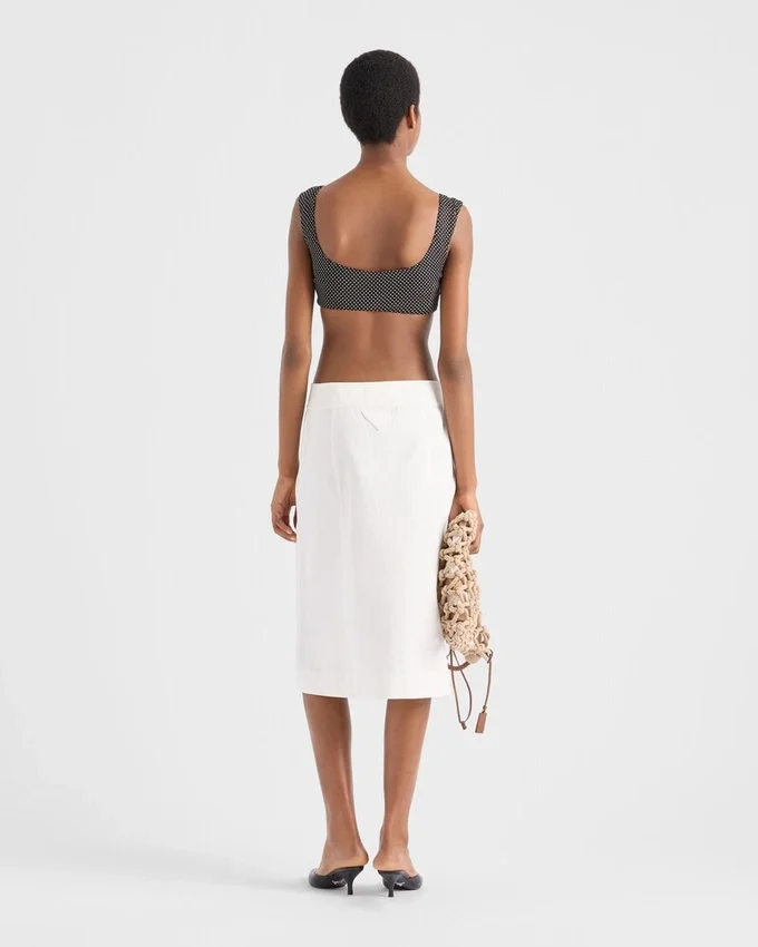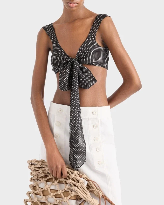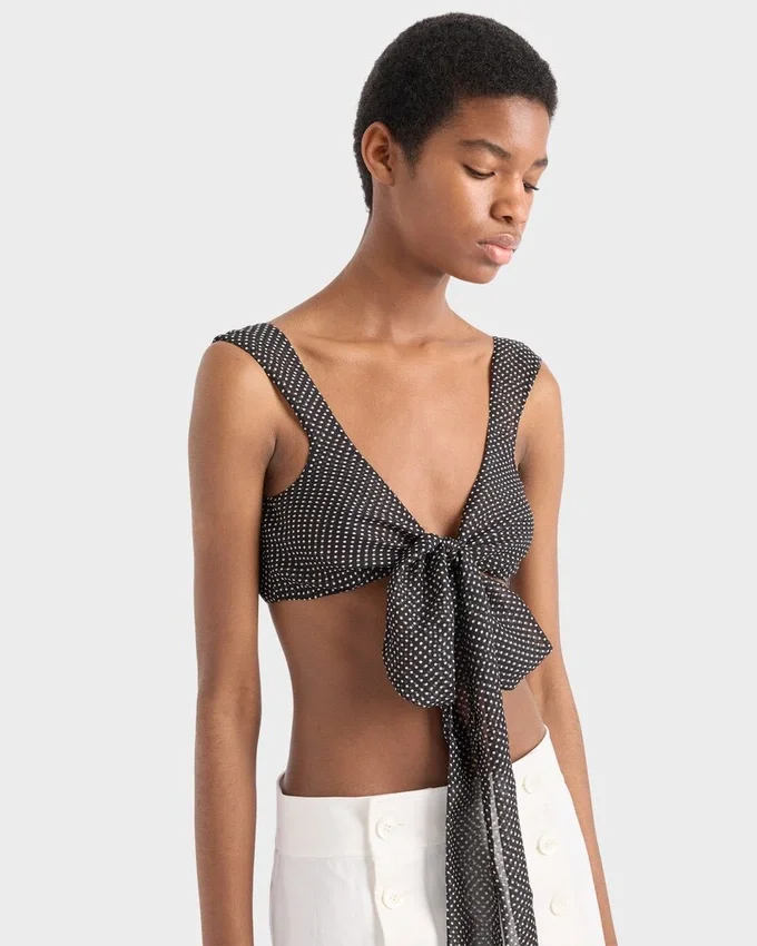 The Delicate Elegance of Silk Chiffon Defines This Bralette Top with Plunging Neckline Animated by a Refined Polka-Dot Print.