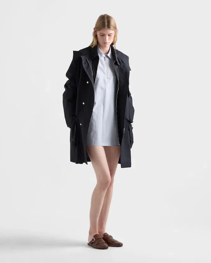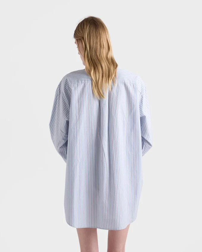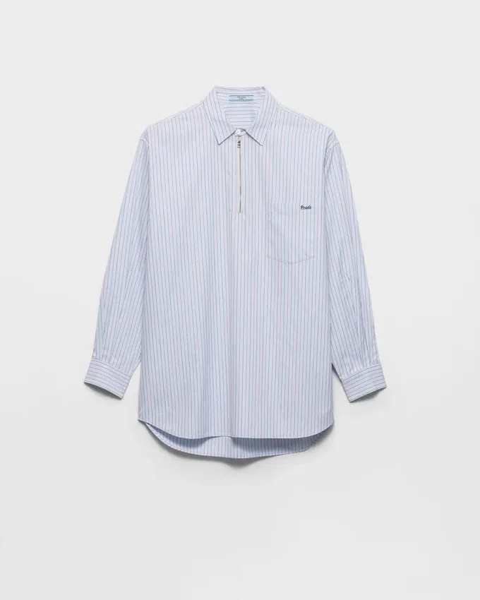 The Duality That Characterizes Prada Collections is Reflected in the Creation of Hybrid Designs That Blend Different Materials and Styles to Create Something Innovative. The Oversized Shirt with Classic Collar, a Wardrobe Staple, is Reimagined with a Zipper Closure That Adds a Contemporary Accent. The Iconic Embroidered Logo Decorates the Garment.