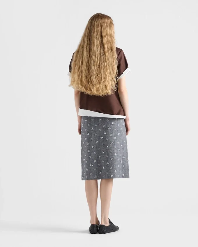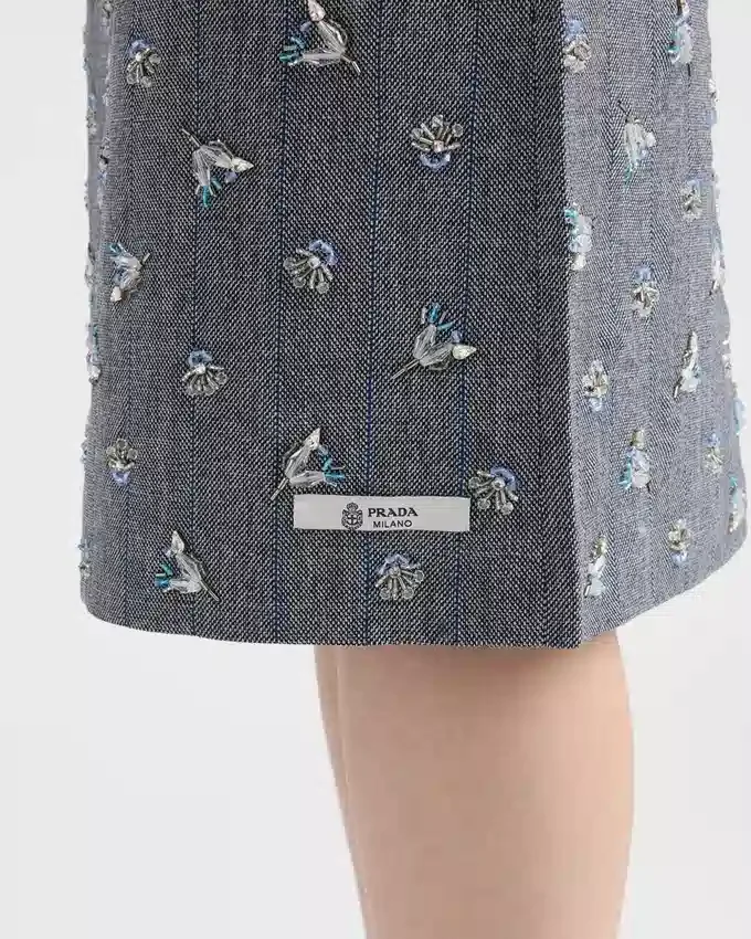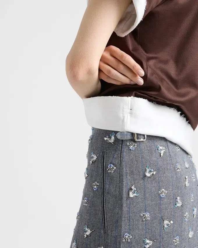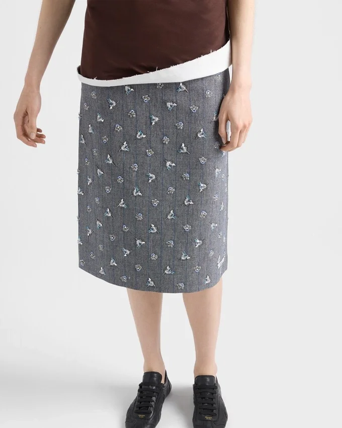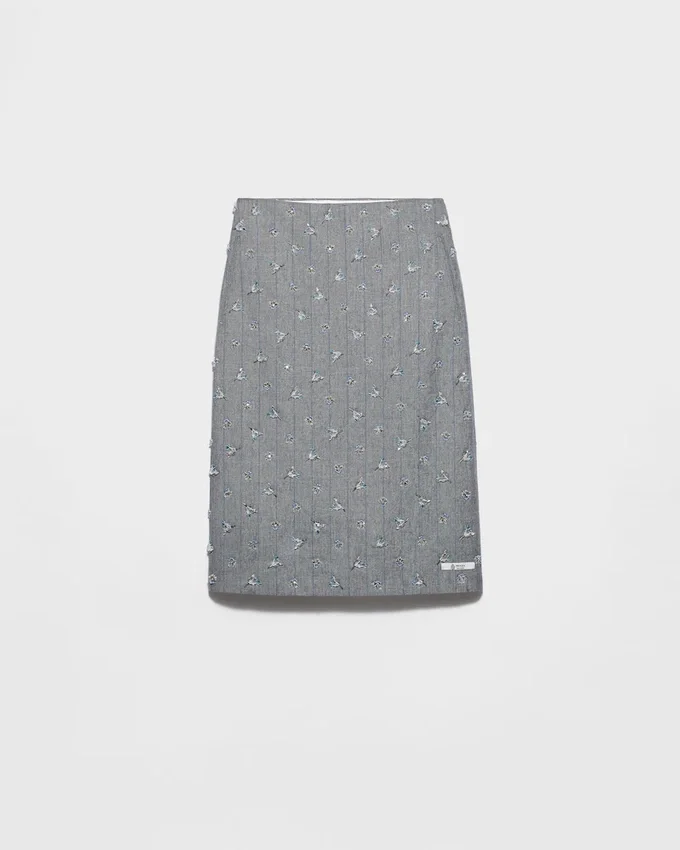 Sophisticated Interactions and Contrasts Define This Wool Skirt with a Geometric Silhouette Emphasized by the Pinstripe Motif. Shimmering Embroidery Softens the Sartorial Rigor of the Style with Delicate, Romantic Notes.