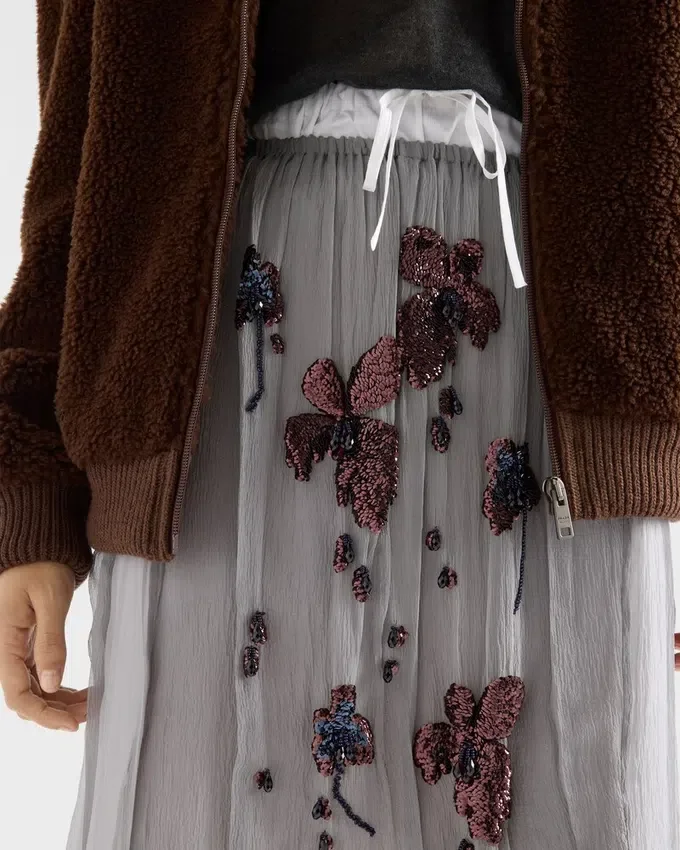 This Skirt That Blends Layering and Delicate Contrasts Expresses an Intimate Style and Innate Elegance. The Lightweight Silk Chiffon Silhouette is Embellished with Shimmering Floral Embroidery That Adds a Romantic Touch.