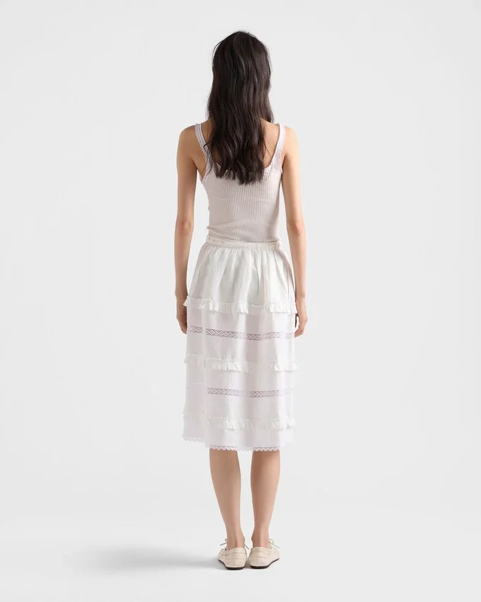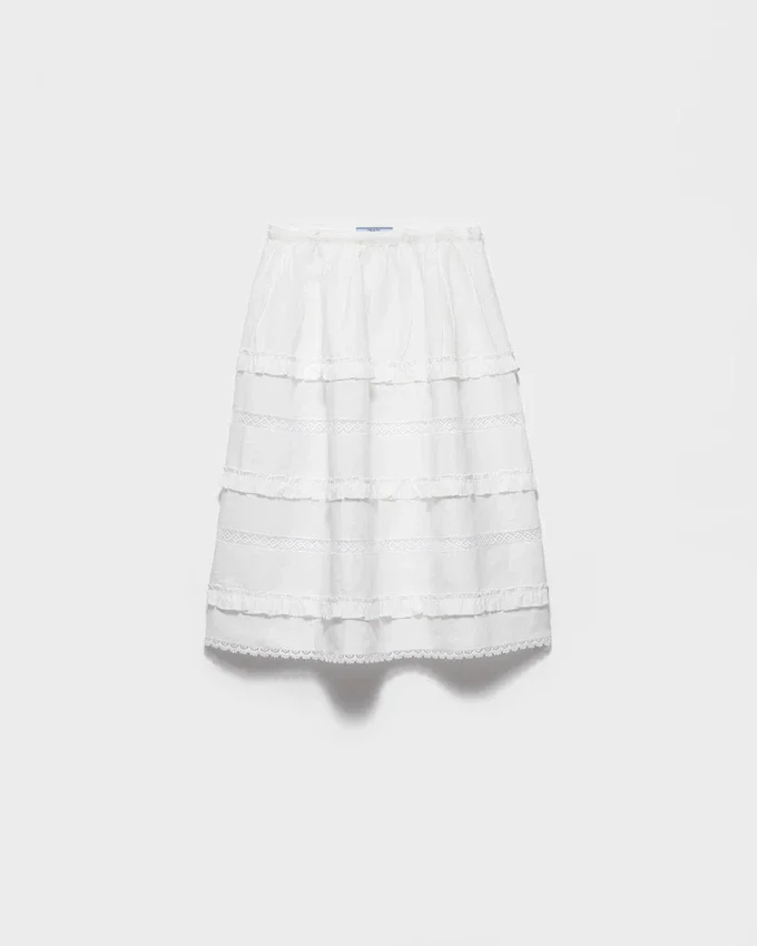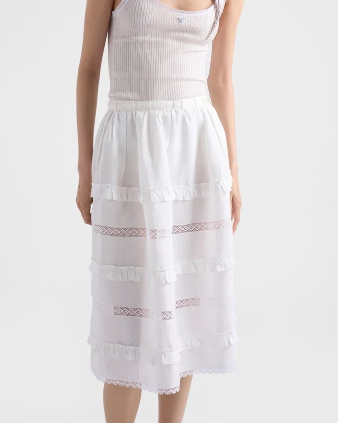 Romantic Flounces and Precious Hand-Made Embroidery Create This Linen Skirt with a Full Silhouette. Lightness and Artisan Workmanship Are Embodied by the Distinctive Symbol of the Prada Triangle Logo.