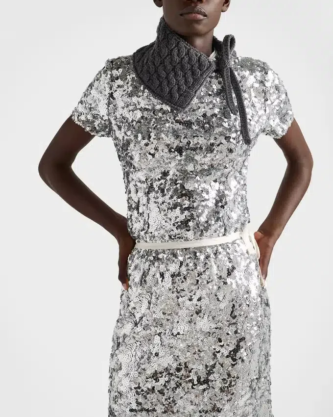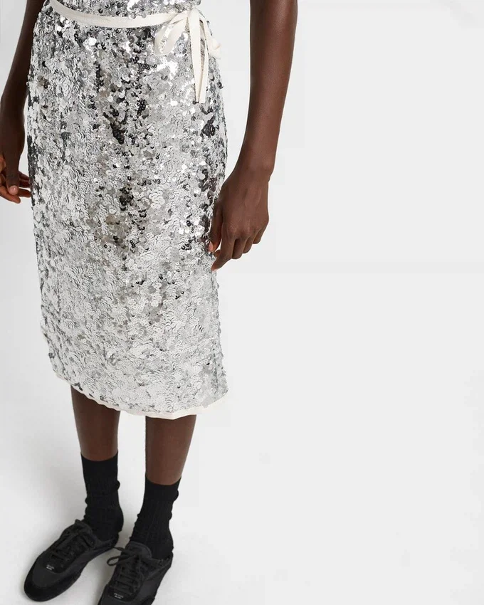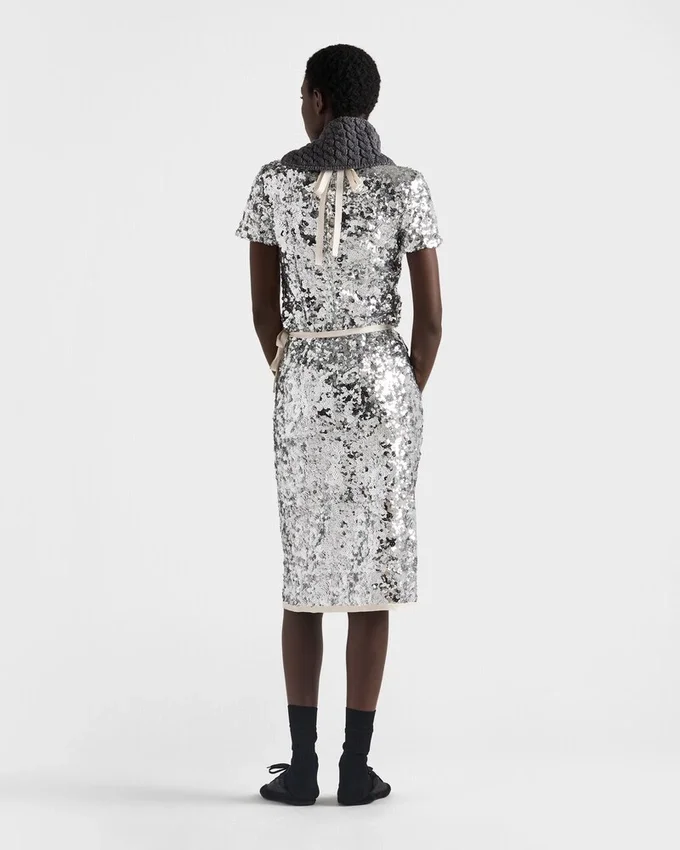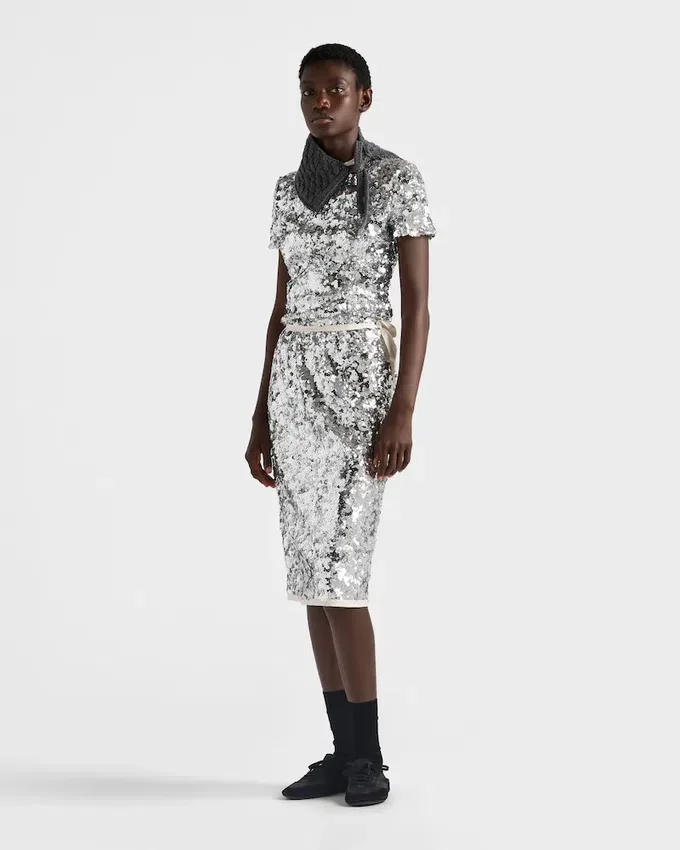 Delicately Embroidered with All-Over Sequins, This Skirt Captures Prada’s Sophisticated Spirit, Blending Radiant Design with Exquisite Artisanal Craftsmanship.