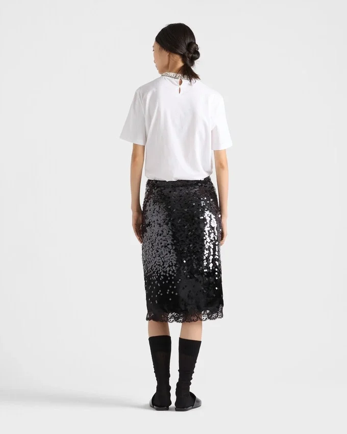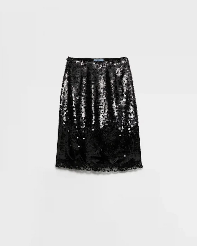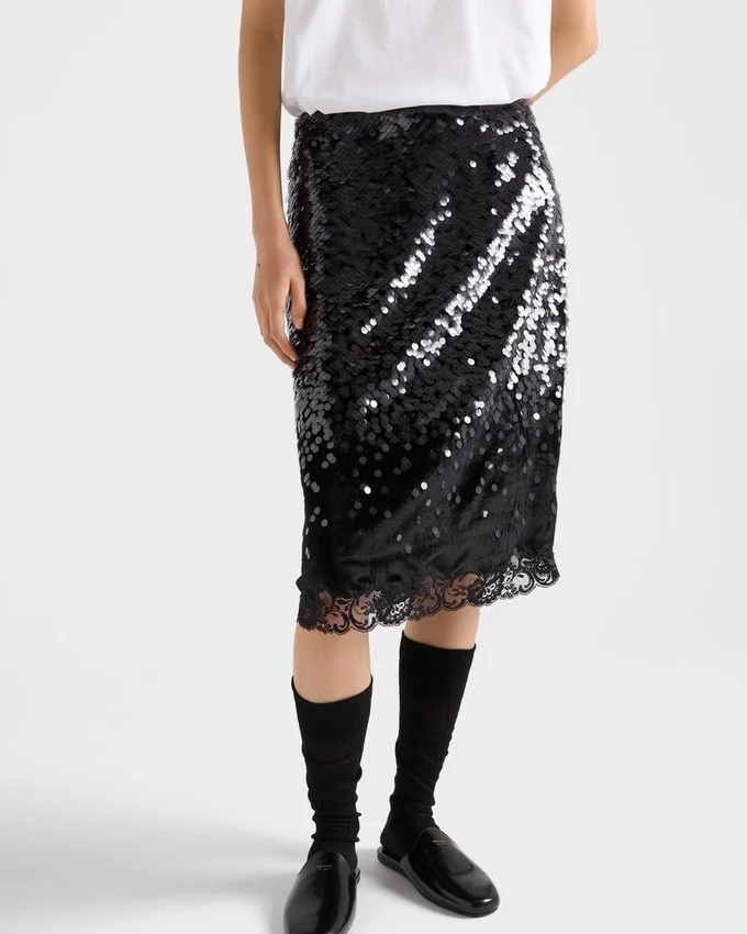 This Garment Expresses Sophisticated Femininity. The Velvet is Enriched with Gradient Sequins and Lace Trim That Illuminate the Pencil Silhouette. The Construction with Underskirt and Side Zipper Closure Reflects the Refined Art of Fine Tailoring.