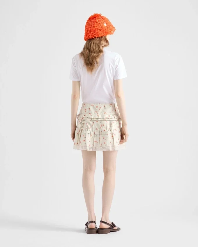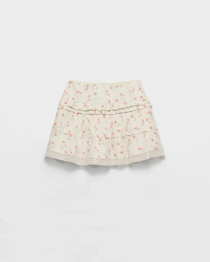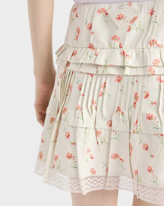 The Silhouette and Details of This Linen Skirt Define a Romantic Garment with Vintage Charm. The Delicate Floral Print Embellishes the Design Featuring Ruffles, Ruching, and a Refined Lace Trim.