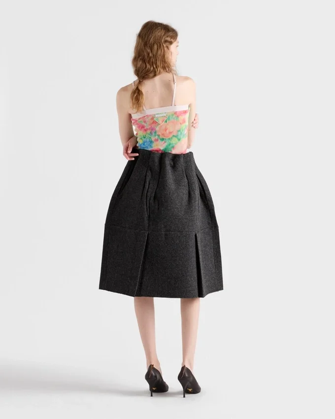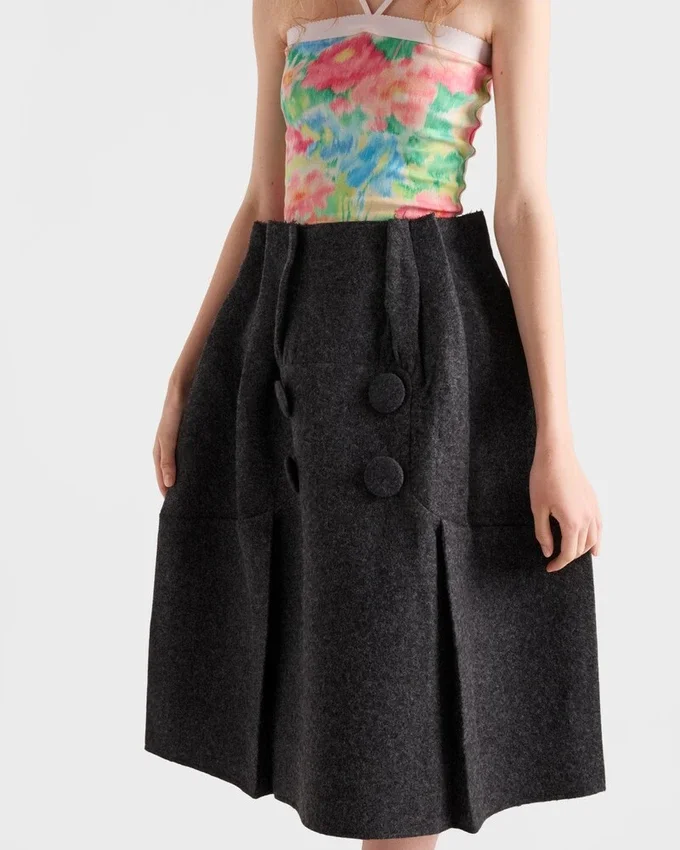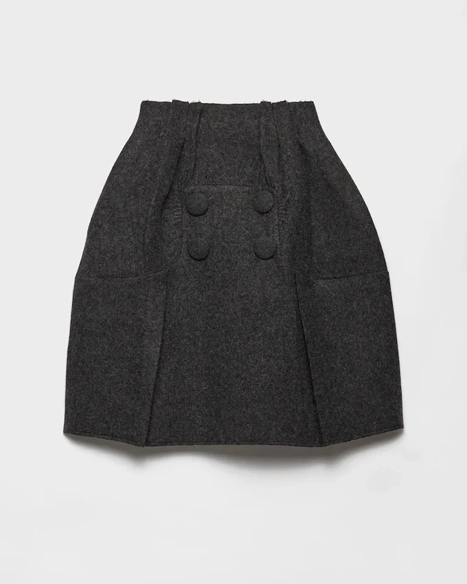 The Fall/Winter 2025 Collection Explores the Perception of Femininity and Redefines Its Iconic Pieces. This Shetland Wool Skirt Features a Structured Silhouette, Highlighted by Soft Draping at the Waist and Accented with Tone-On-Tone Oversized Buttons That Evoke a Vintage Charm.