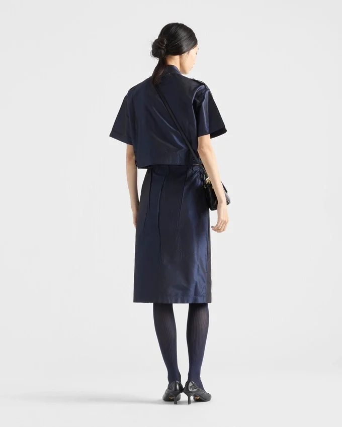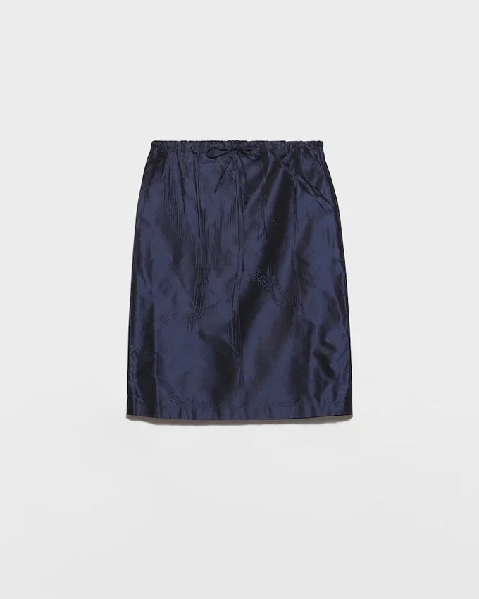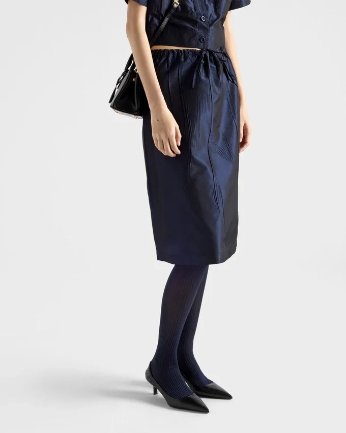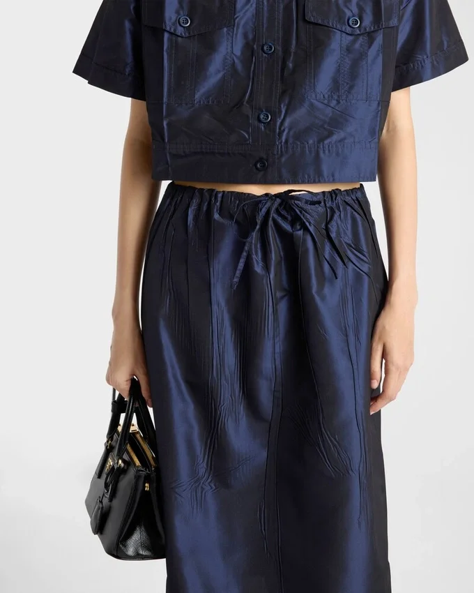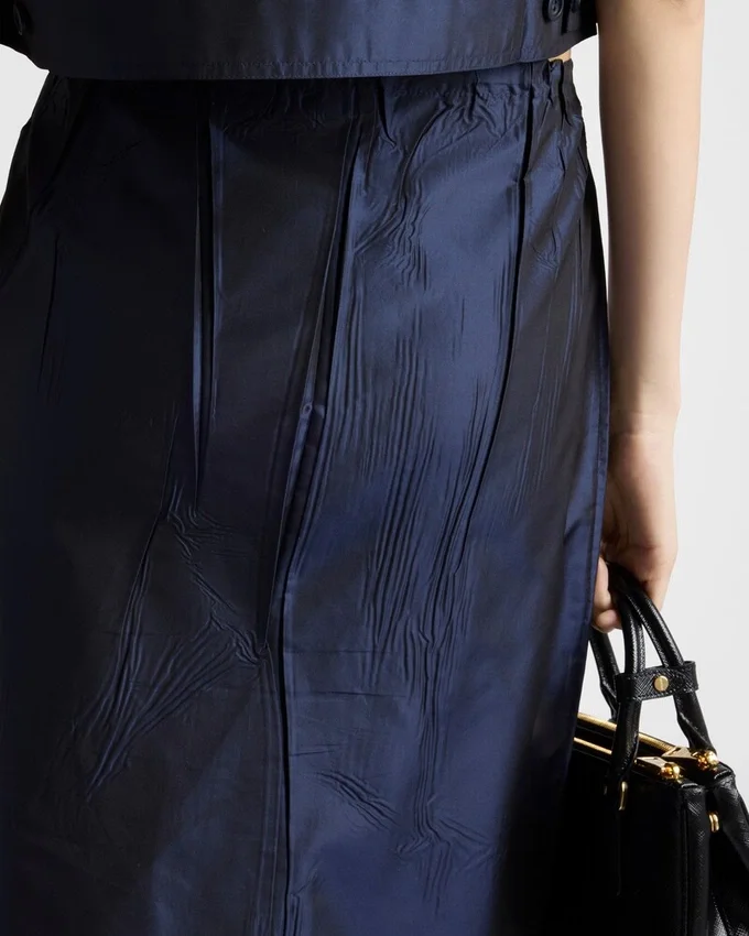 Classic Sartorial Rigor Fades into the Light Lines of This Midi Skirt, an Expression of Poetic and Casual Elegance. The Taffeta Skirt Combines Softness and Structure in a Silhouette with Unexpected Details.