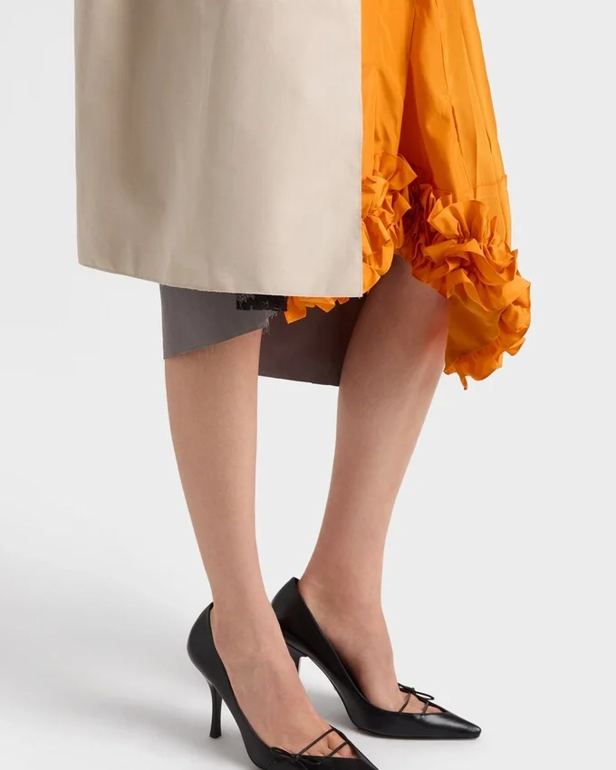 A Bold Encounter Between Fine Materials and Iconic Prada Lines Creates This Skirt with a Distinctive Character. The Patchwork Technique Sculpts an Asymmetrical Silhouette, Enriched with Ruching, Lace and Pleats That Create Dynamic Volumes, an Expression of a Free and Unconventional Elegance.
