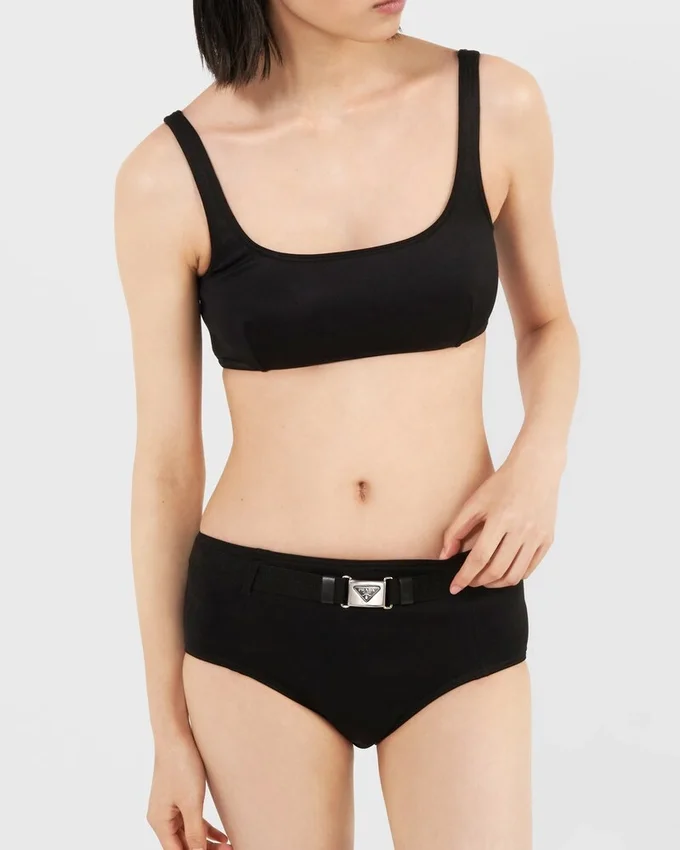 This Bikini Bottom Made of Interlock Fabric Has a High-Waisted Design with Sleek Lines, Defined by a Belt Enriched with the Triangle Logo.