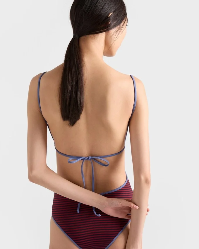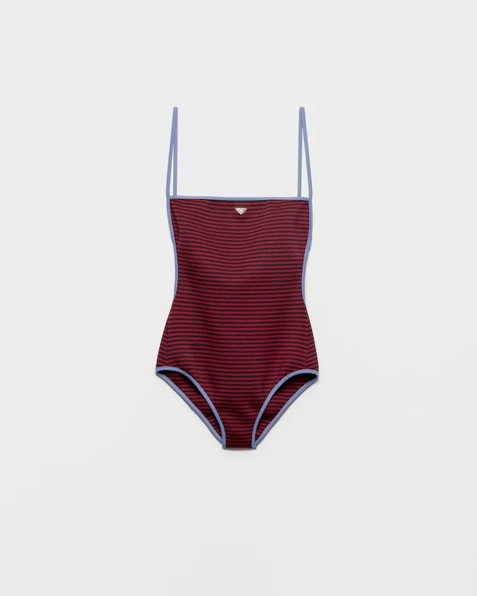 This Alluring One-Piece Swimsuit with a Sleek Silhouette is Sophisticated and Contemporary. The Style with a Square Neckline and Spaghetti Straps is Decorated with the Iconic Enameled Metal Triangle Logo.