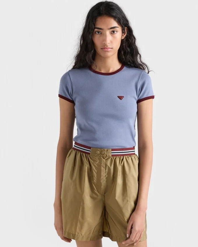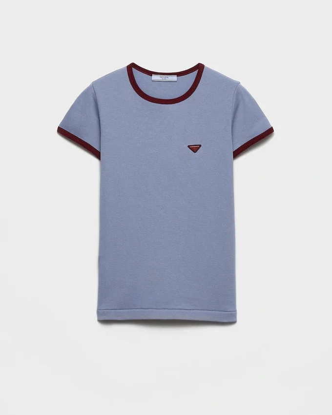 Chromatic Contrasts Characterize This Cotton Tee with a Sporty Character. The Slim-Fit Style with Ribbed Knit Crew Neck is Completed by the Enameled Metal Triangle Logo.