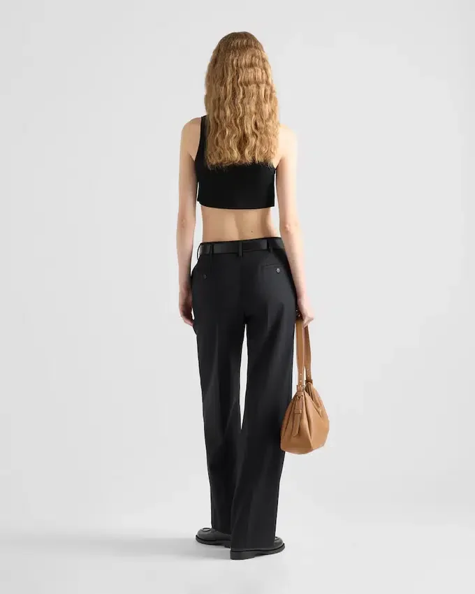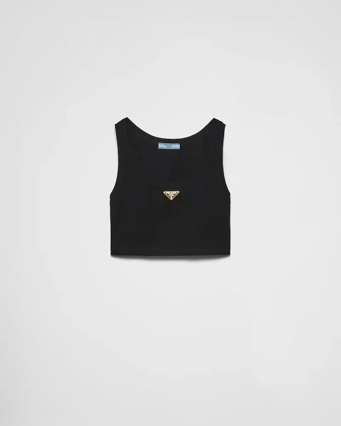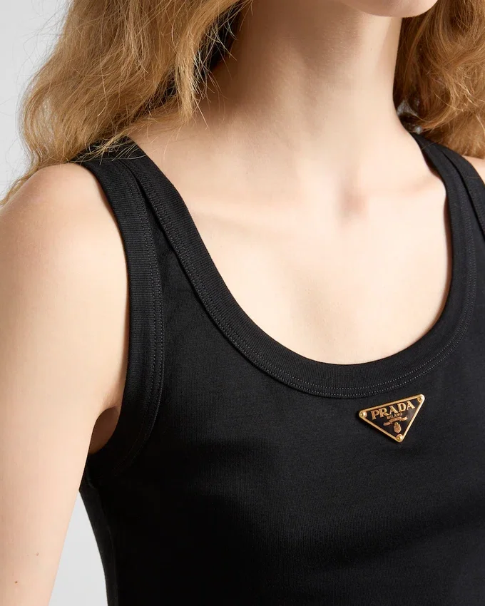 Pragmatic Garments Acquire New Importance and Value. This Tank Top with a Typical Menswear Line is Transformed by a Feminine Touch. Essentially Prada, the Garment Embodies the Luxury of Simplicity. The Triangle Logo Stands out on the Front.