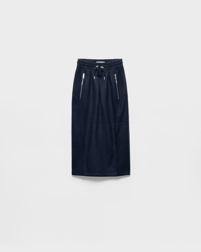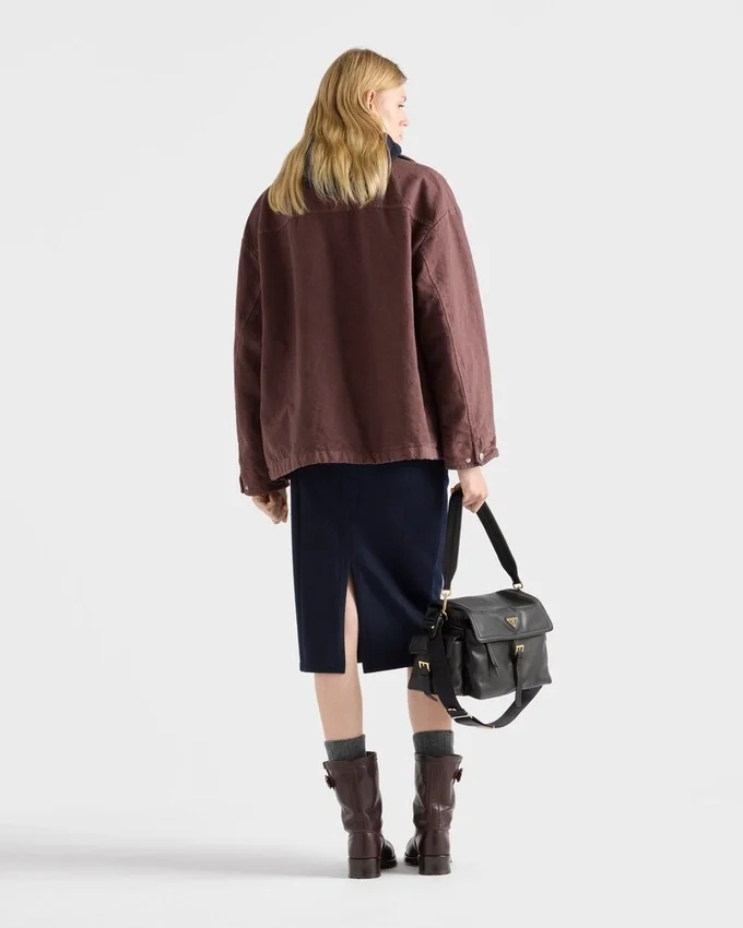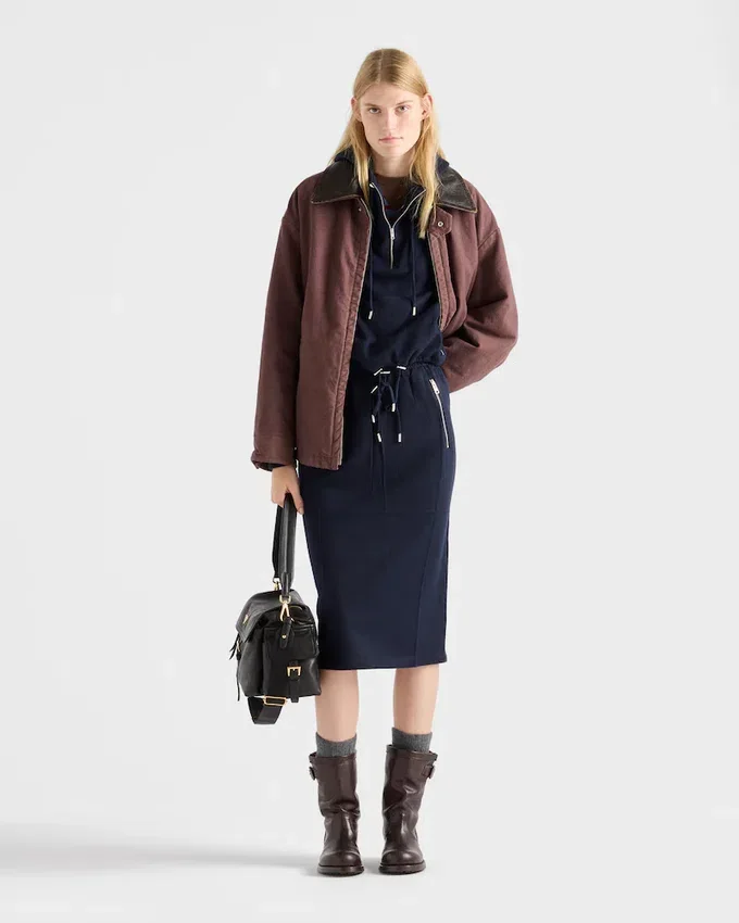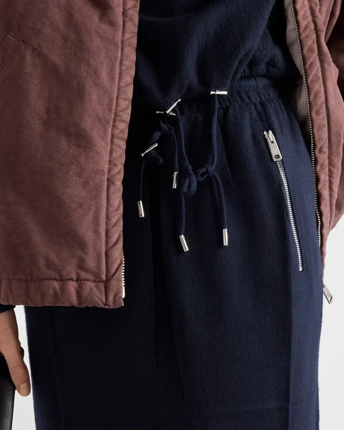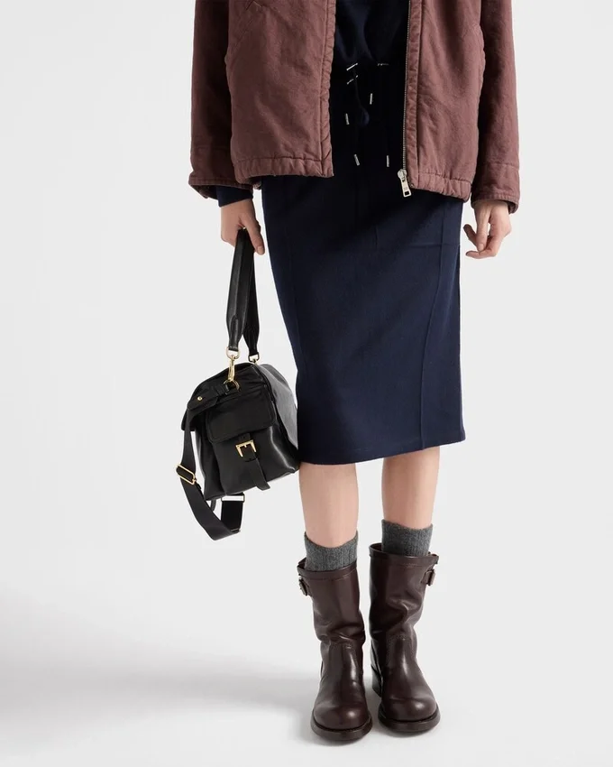Fluidity and Comfort Blend in a Modern Silhouette. Distinctive Details Like the Triangle on the Back Transform This Skirt in an Emblematic Piece of Prada Creativity