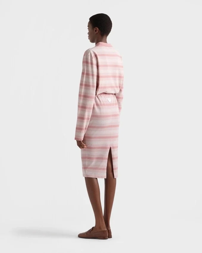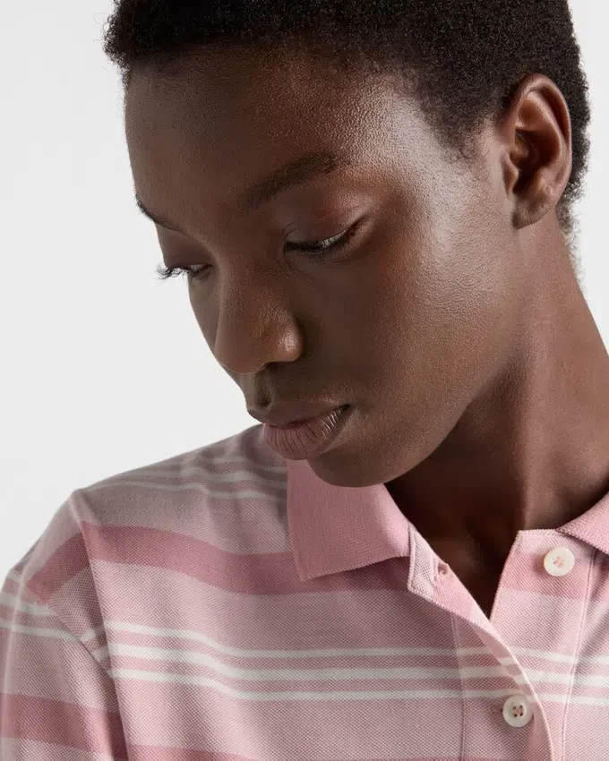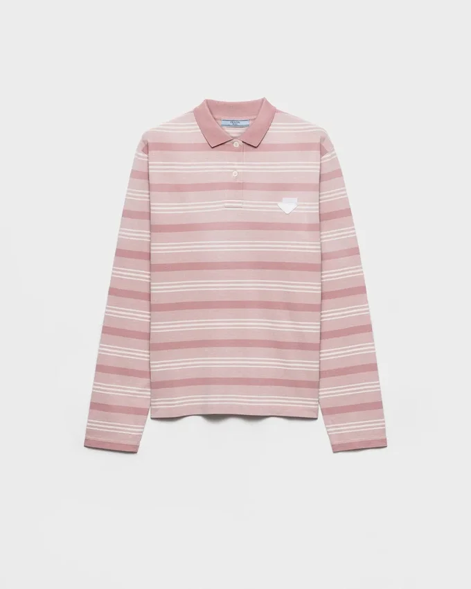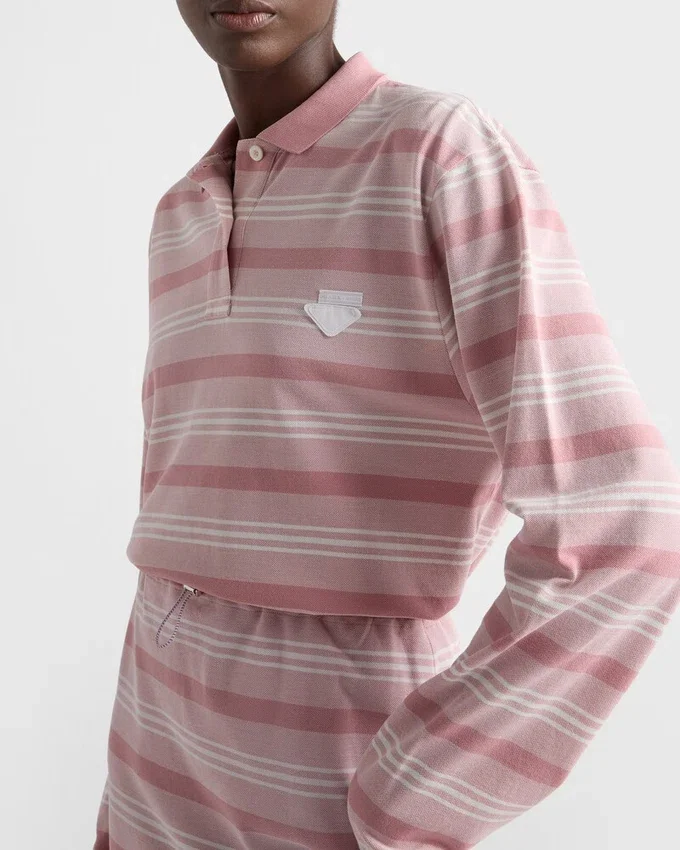 A Subtle Stripe Motif Animates This Long-Sleeved Piqué Polo Shirt Characterized by an Oversized Fit and Decorated with the Triangle Logo.